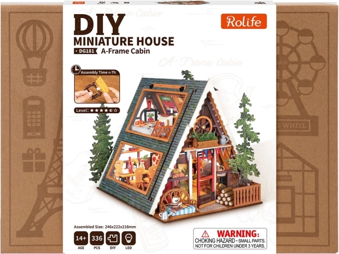 Ricrea l’atmosfera del glamping moderno direttamente a casa. Il modello con tetto a due falde colpisce per le ampie pareti vetrate, la finestra apribile e l’interno studiato nei dettagli: soggiorno luminoso, zona pranzo completamente attrezzata, scala in legno e camera mansardata. Non mancano il balcone con mini giardino, la stufa in legno, cornici decorative e una chitarra: ogni dettaglio farà felici gli amanti delle miniature.