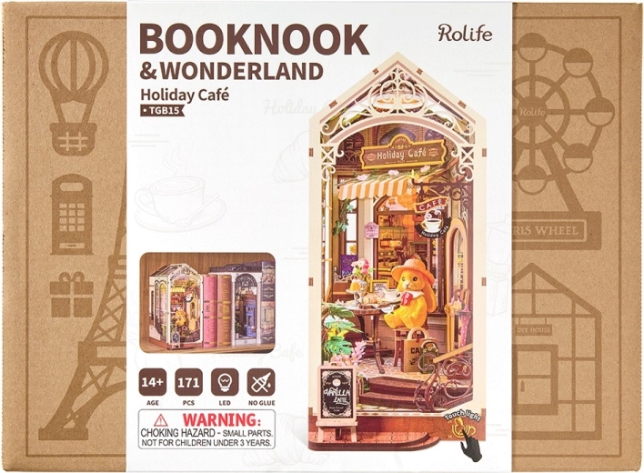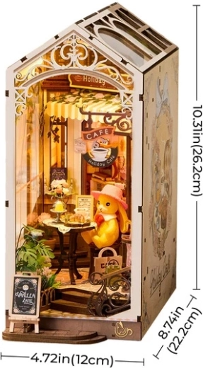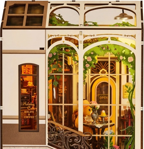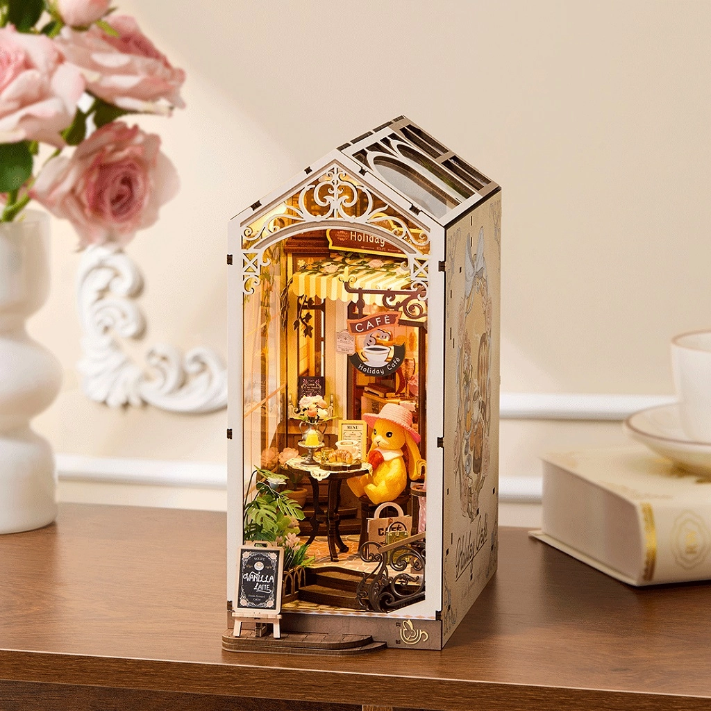Questa miniatura finemente realizzata porta l’atmosfera di una caffetteria estiva accogliente direttamente nella tua libreria. La struttura aperta con ampie finestre laterali, accessori realistici e una calda retroilluminazione LED trasformano lo scaffale dei libri in un piccolo mondo pieno di calma e nostalgia. Il modello funziona anche egregiamente come fermalibri stabile e come decorazione elegante per tavolo o scaffale.