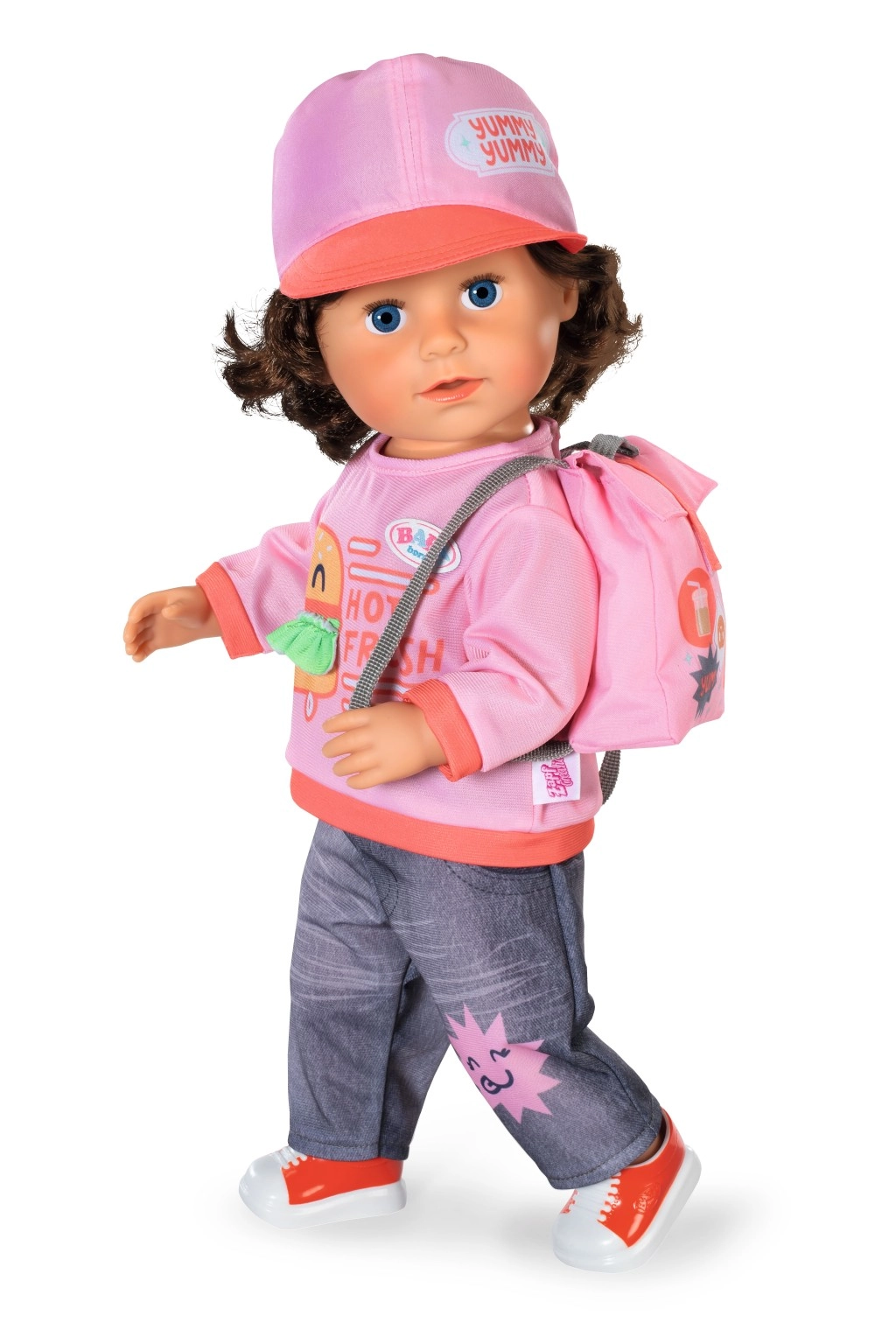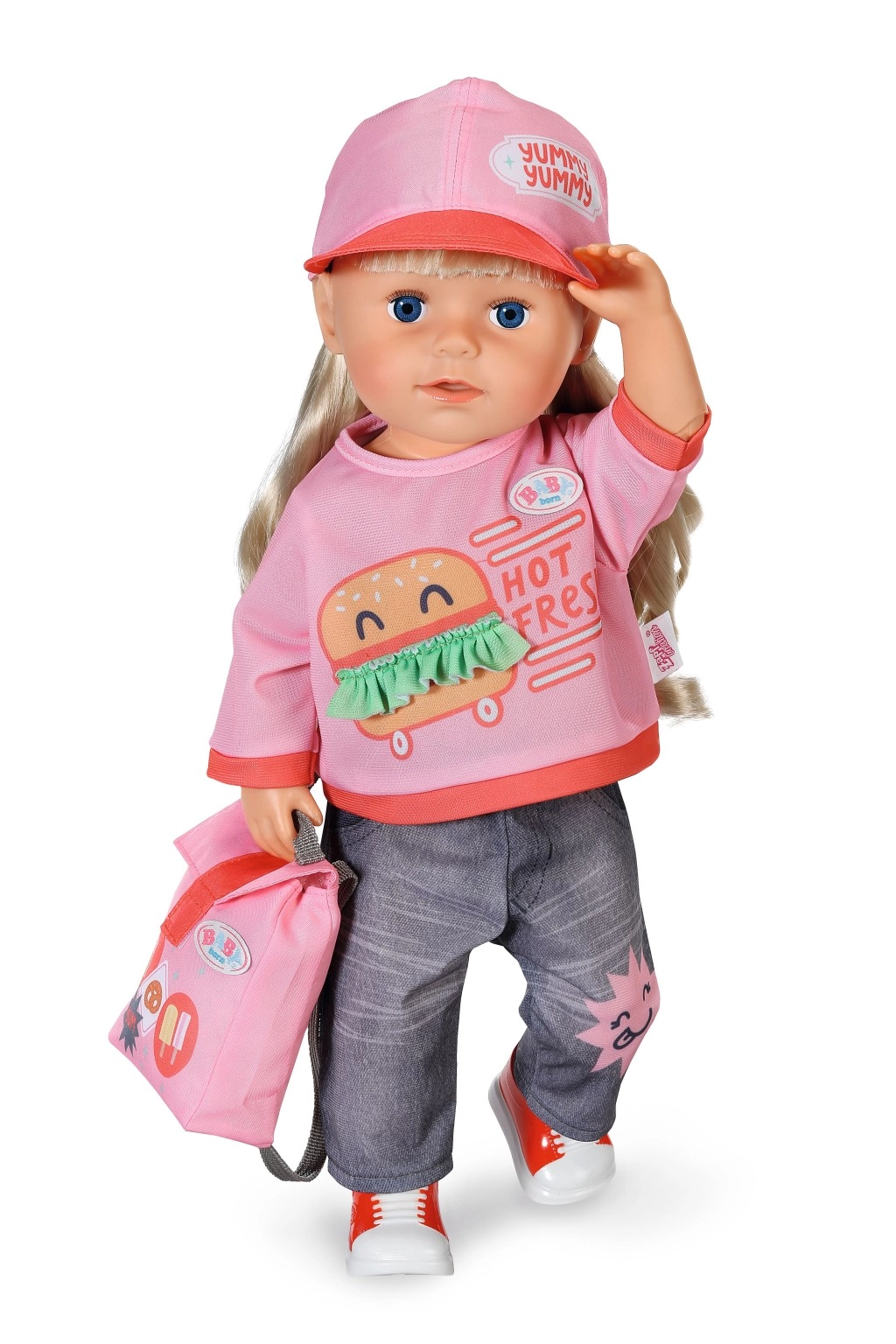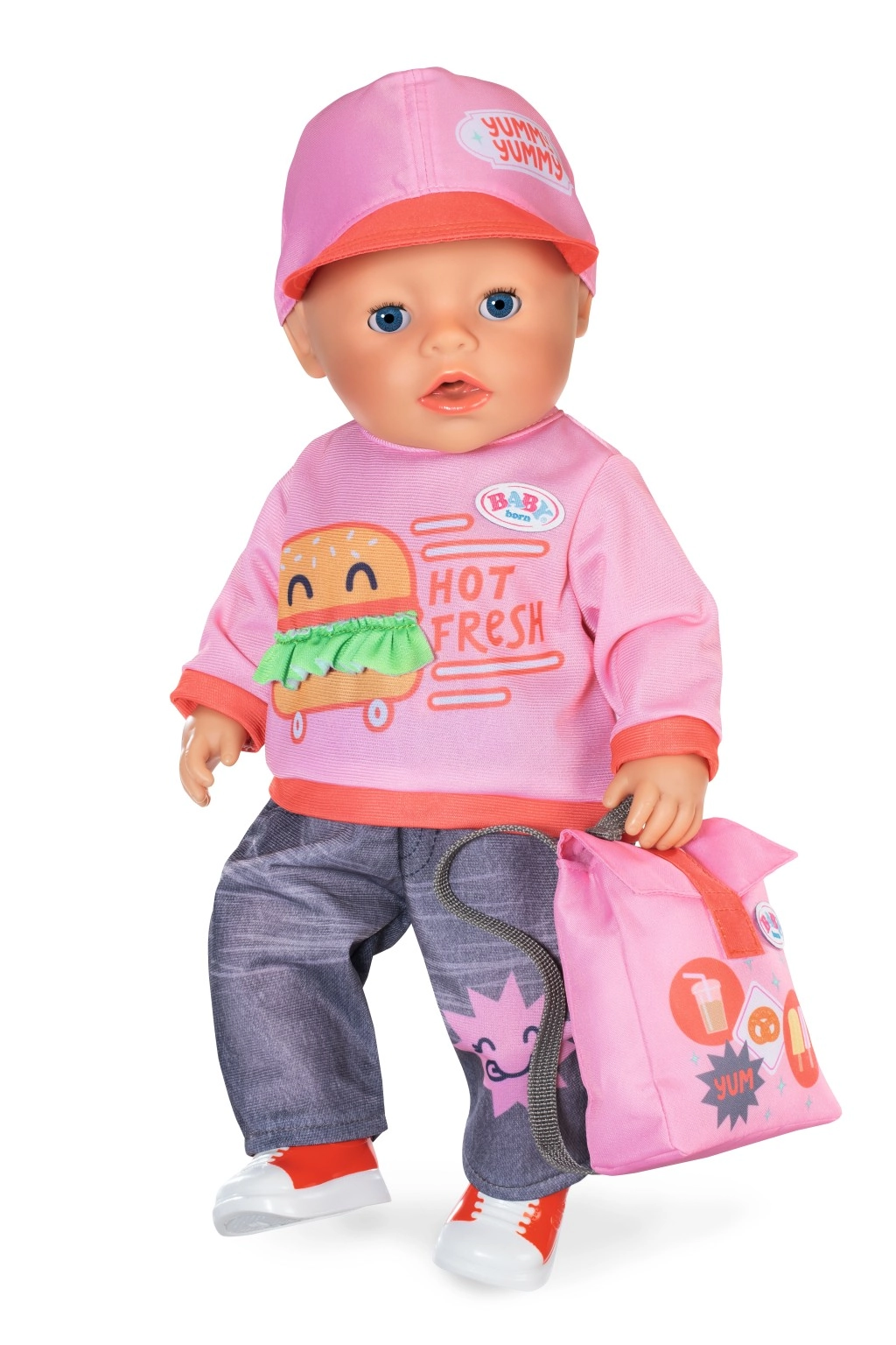 L’outfit include una maglietta rosa con stampa burger e scritta, pantaloni/leggings in denim stampati, un cappellino rosa con visiera, sneaker slip-on rosse e un leggero zainetto rosa con stampa di snack. Tutto è armonizzato nei colori e progettato per un gioco duraturo e una facile combinazione con altri accessori BABY born.