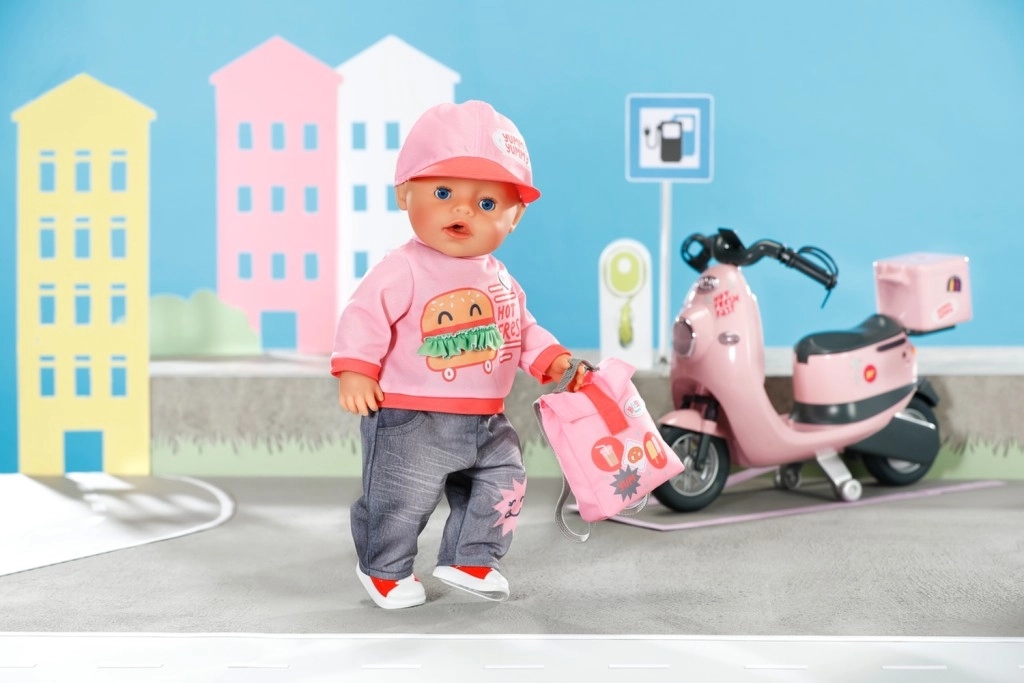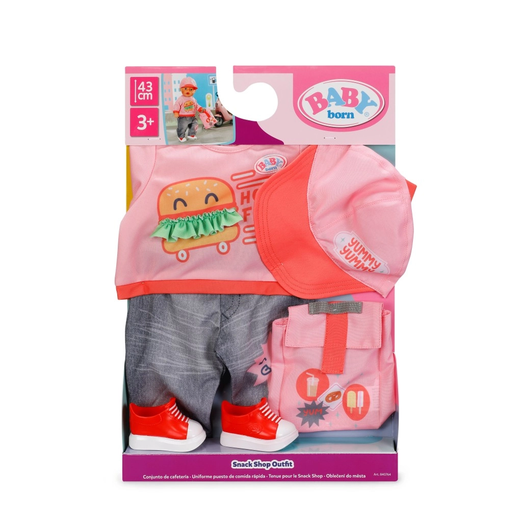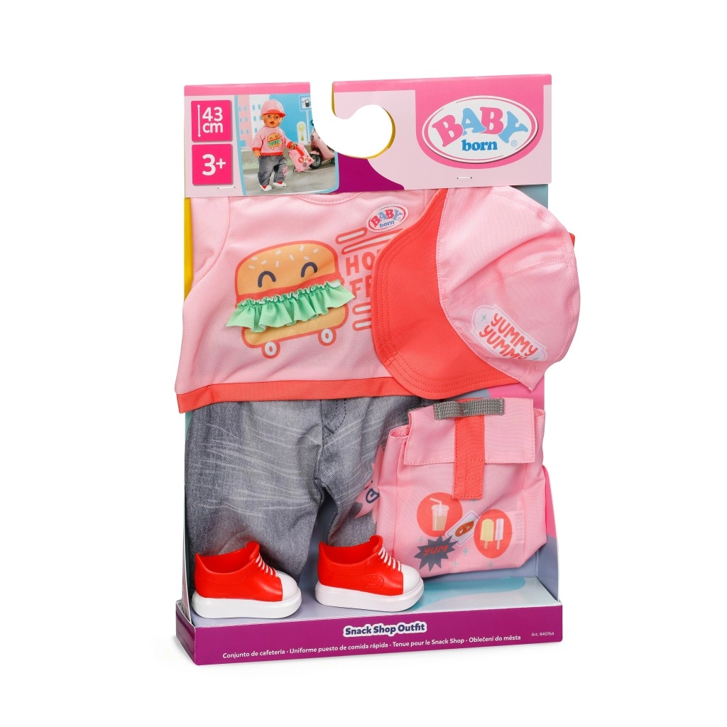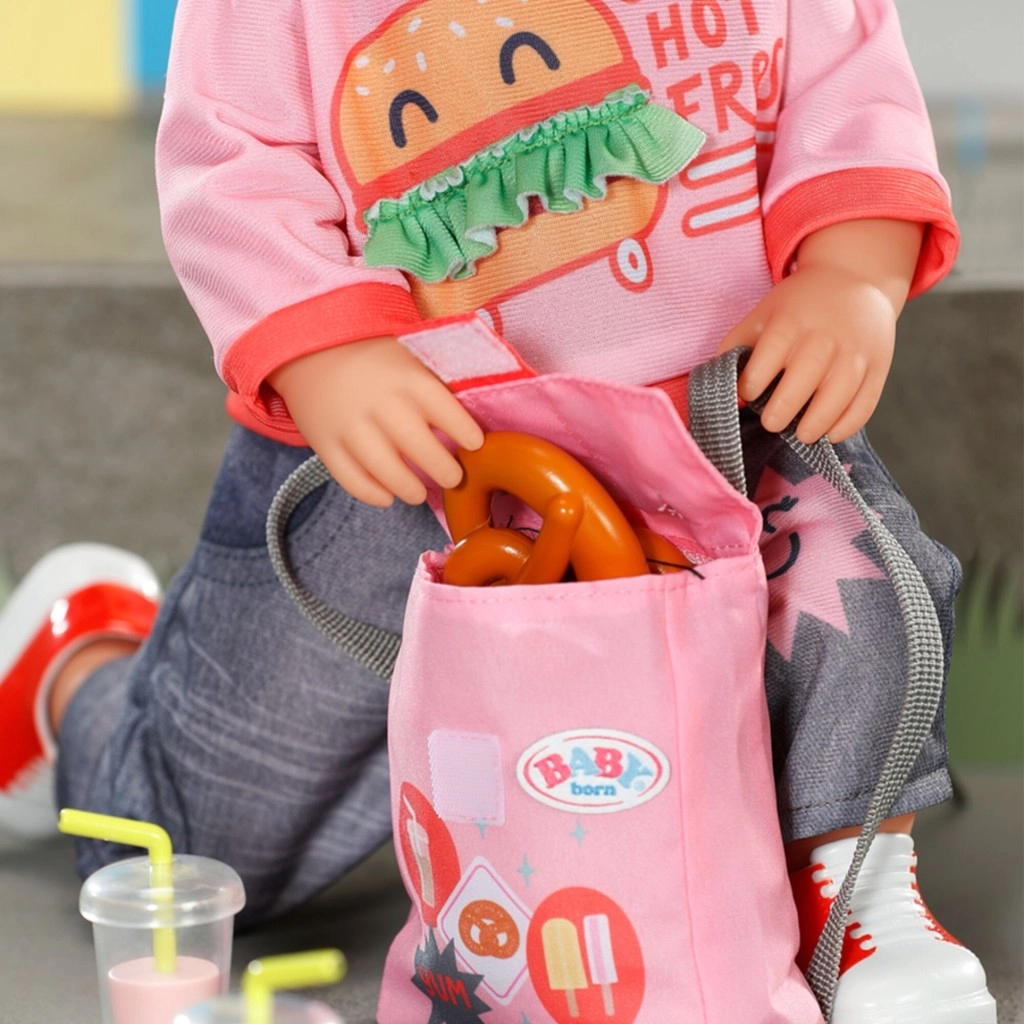Set di abbigliamento alla moda per bambole BABY born in misura 43 cm che include tutto per consegnare golosità in modo giocoso: maglietta con stampa burger, comodi jeans, scarpe da ginnastica rosse, cappellino rosa con visiera e zainetto pratico. Si abbina perfettamente al carrellino con snack e sostiene giochi di ruolo creativi per bambini dai 3 anni.