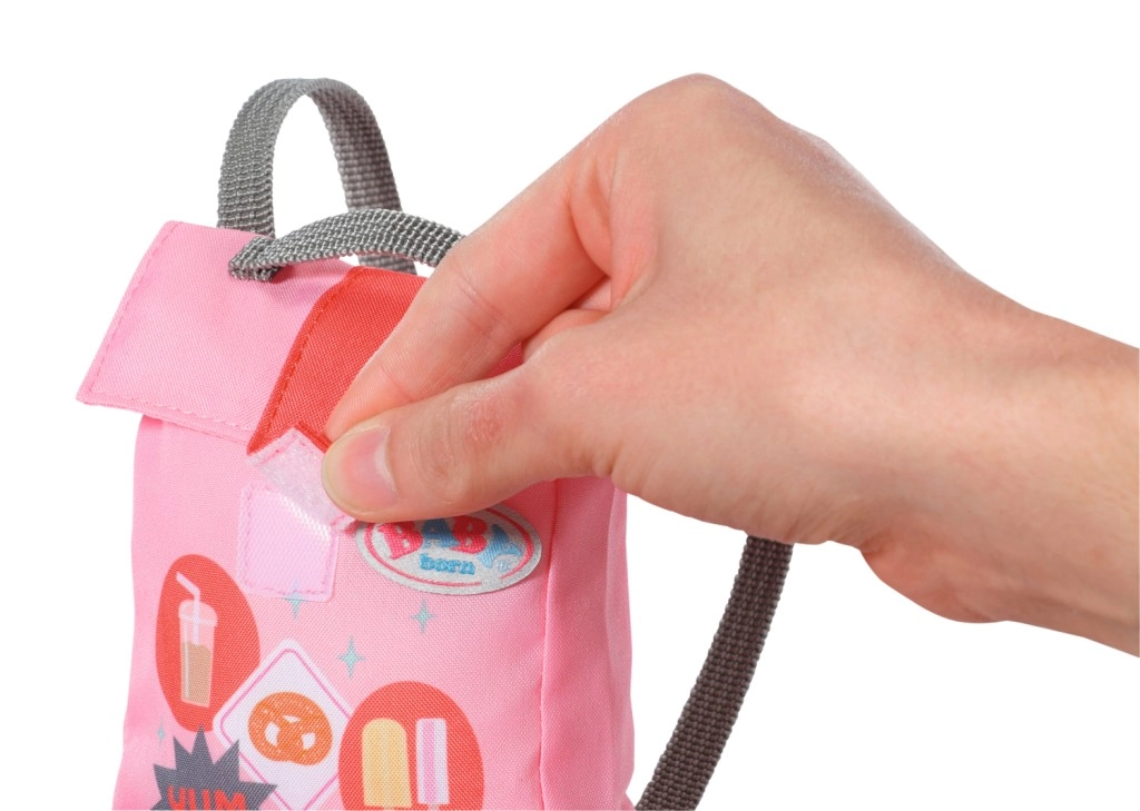 Zaino leggero con stampa di snack e spazio sufficiente per piccoli accessori, perfetto per ogni gita della bambola in città.