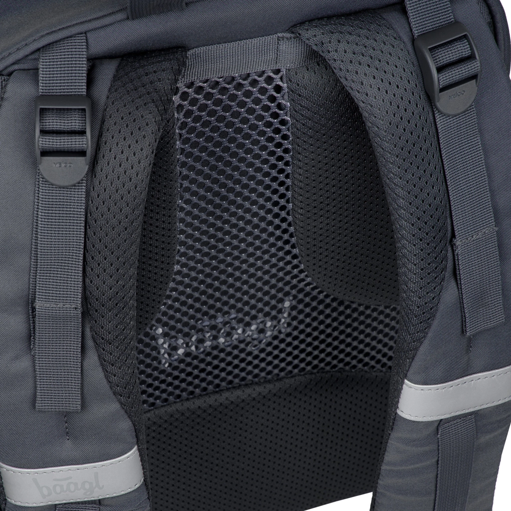Zaino scolastico BAAGL Core Logo, leggero ed ergonomico, per bambini dalla 3ª classe, offre volume 25 l, solo 900 g, schienale anatomico ventilato e tasca imbottita per notebook da 15". Realizzato in materiale riciclato idrorepellente con certificazione GRS, dispone di affidabili cerniere YKK, elementi riflettenti e un'organizzazione pratica in tre scomparti.