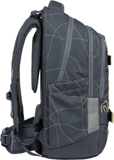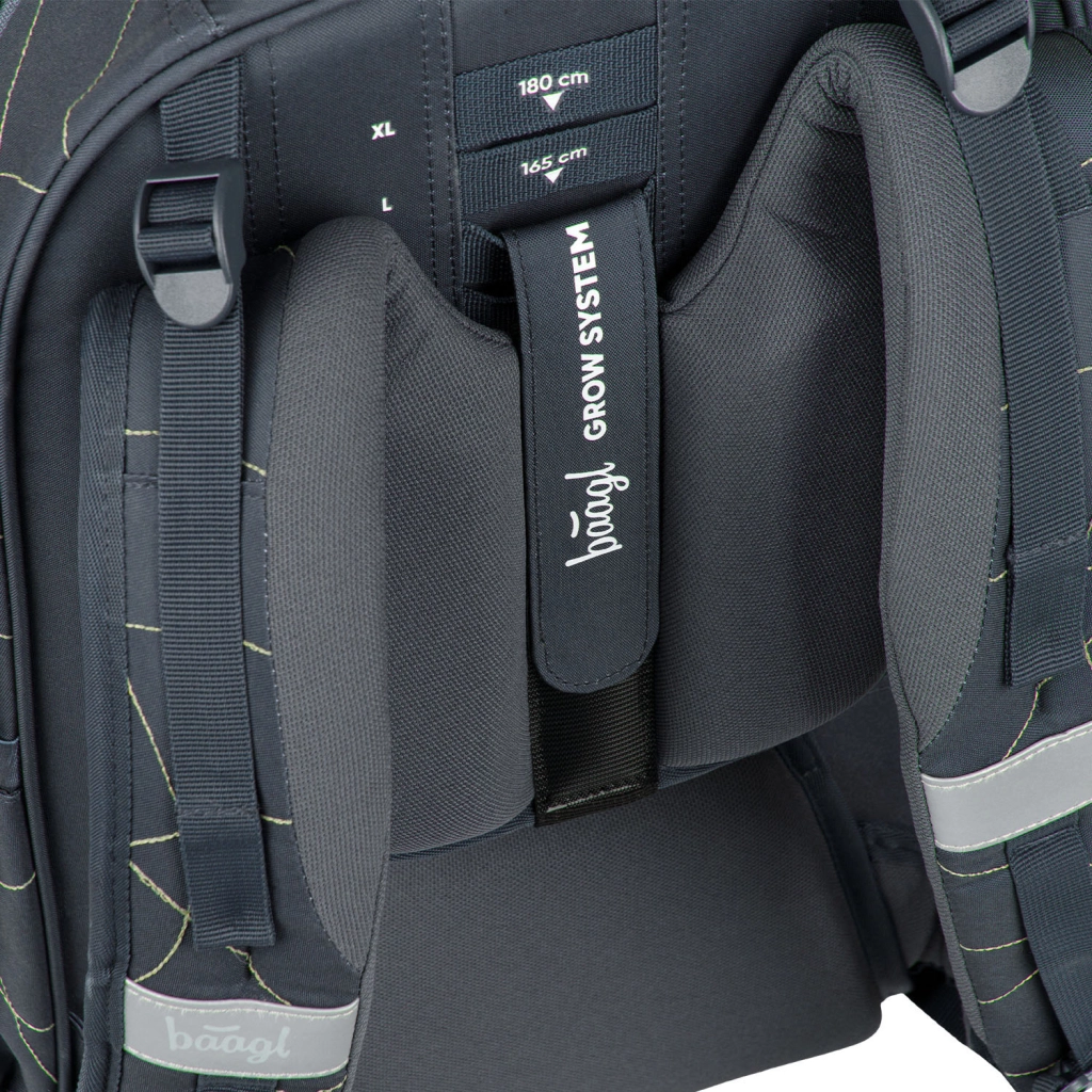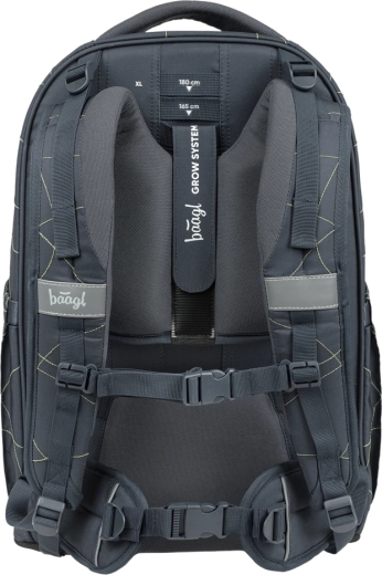 BAAGL Skate Max Wave GRS è uno zaino ben studiato per alunni e studenti alti 135–185 cm. Grazie al sistema dorsale scorrevole cresce comodamente con il bambino in quattro misure. La struttura con rinforzo in EVA mantiene perfettamente la forma, la cintura lombare removibile aumenta la stabilità e gli spallacci ergonomici con morbida rete proteggono la zona del collo.