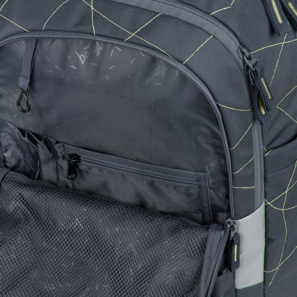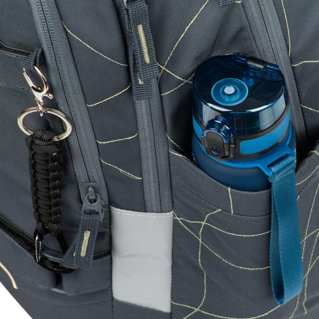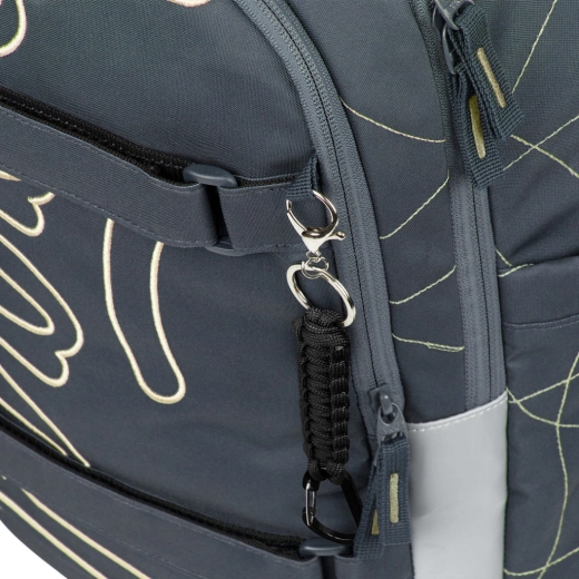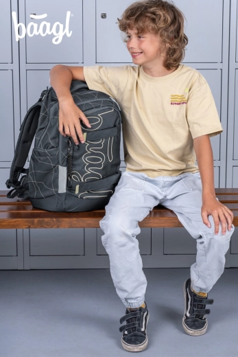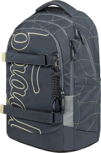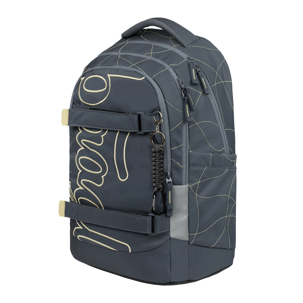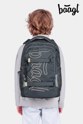 Lo spazio interno comprende un organizer a tre scomparti con tasca in velluto per notebook, che protegge i dispositivi dai graffi. Le tasche laterali rigide ospitano le bottiglie BAAGL in tritan, la compressione frontale trattiene una felpa o lo skateboard e il ciondolo stiloso dona un look personale allo zaino.