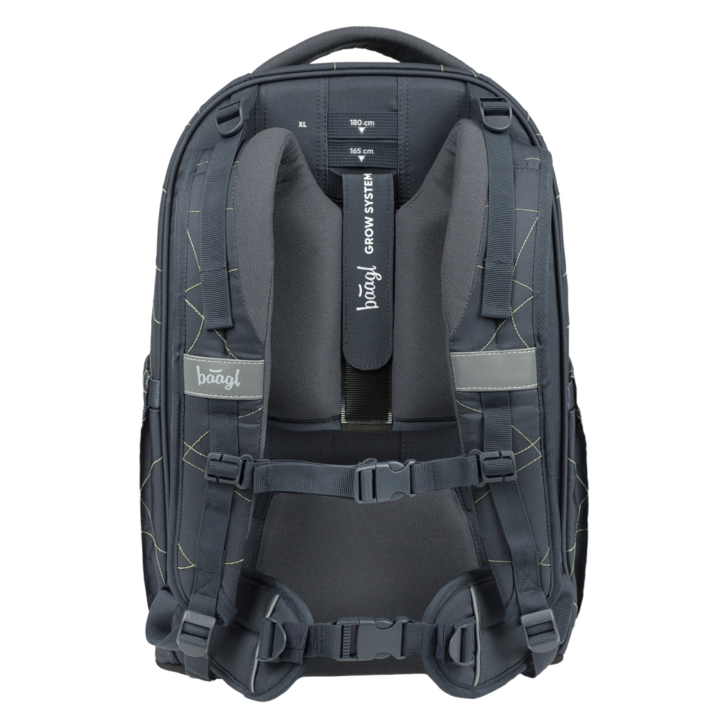 Il set scolastico BAAGL Skate Max Wave è pensato per alunni e studenti indicativamente dalla 3ª classe della scuola primaria fino alle superiori (135–185 cm). Il protagonista è lo zaino leggero (1150 g) con sistema dorsale regolabile in altezza in quattro taglie, che si adatta perfettamente alla crescita del bambino. Il rinforzo in EVA mantiene la forma, la cintura lombare rimovibile assicura stabilità e gli elementi riflettenti aumentano la visibilità al crepuscolo.