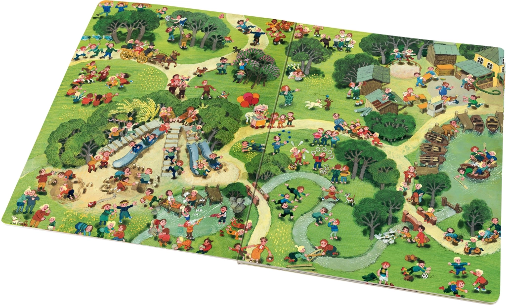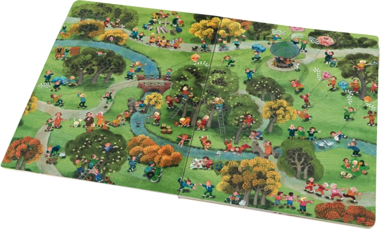 Questo albo illustrato di grande formato accompagna i bambini in un vivace parco cittadino attraverso quattro stagioni – primavera, estate, autunno e inverno. Ogni pagina è ricca di piccole storie, attività e personaggi che cambiano a seconda dell’ora del giorno e del meteo. Grazie alle illustrazioni ricche, i bambini scoprono sempre nuove connessioni e sviluppano la capacità di osservazione.