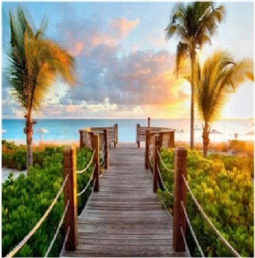 Creazione rilassante e risultato d’effetto in uno. La pittura diamantata consiste nell’incollare piccoli strass sui punti contrassegnati della tela usando penna e cera. Il procedimento è intuitivo e adatto a principianti e a bambini sotto la supervisione di un adulto. Il quadro finito con il motivo esotico del ponte e delle palme diventerà una splendida decorazione per la tua casa.