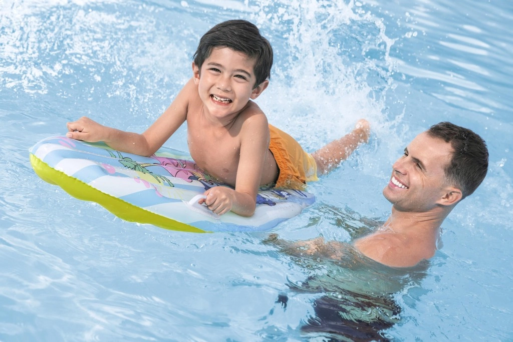 La tavola è progettata per un divertimento comodo e sicuro: due maniglie laterali per una presa sicura, più camere per la stabilità e una valvola di qualità per gonfiaggio e sgonfiaggio rapidi. Ideale per la piscina, le vacanze e il lago: favorisce il movimento, la sicurezza in acqua e un divertimento senza fine.