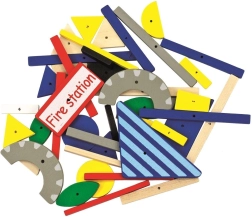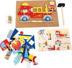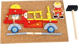 Forme e immagini in legno colorate su una base in sughero stimolano la fantasia e permettono di comporre autopompe, stazioni e intere scene.