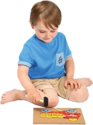 I bambini posizionano i pezzi e li fissano delicatamente con il martelletto. Il gioco rafforza la coordinazione occhio–mano, la pazienza e la precisione.