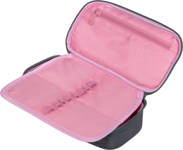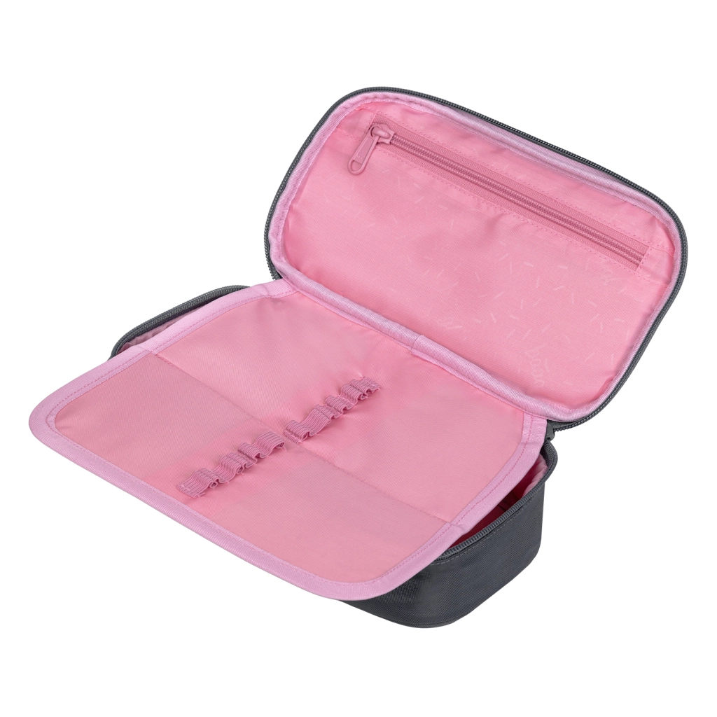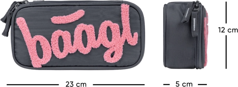 Il pratico astuccio BAAGL in elegante grigio scuro con logo rosa unisce look moderno e suddivisione intelligente. Lo scomparto principale è sufficientemente spazioso per strumenti di scrittura e piccoli oggetti, mentre la doppia patta ribaltabile con passanti elastici mantiene tutto ben organizzato. Non mancano una tasca interna e una finestra trasparente per l'orario, per un rapido orientamento durante la giornata scolastica.