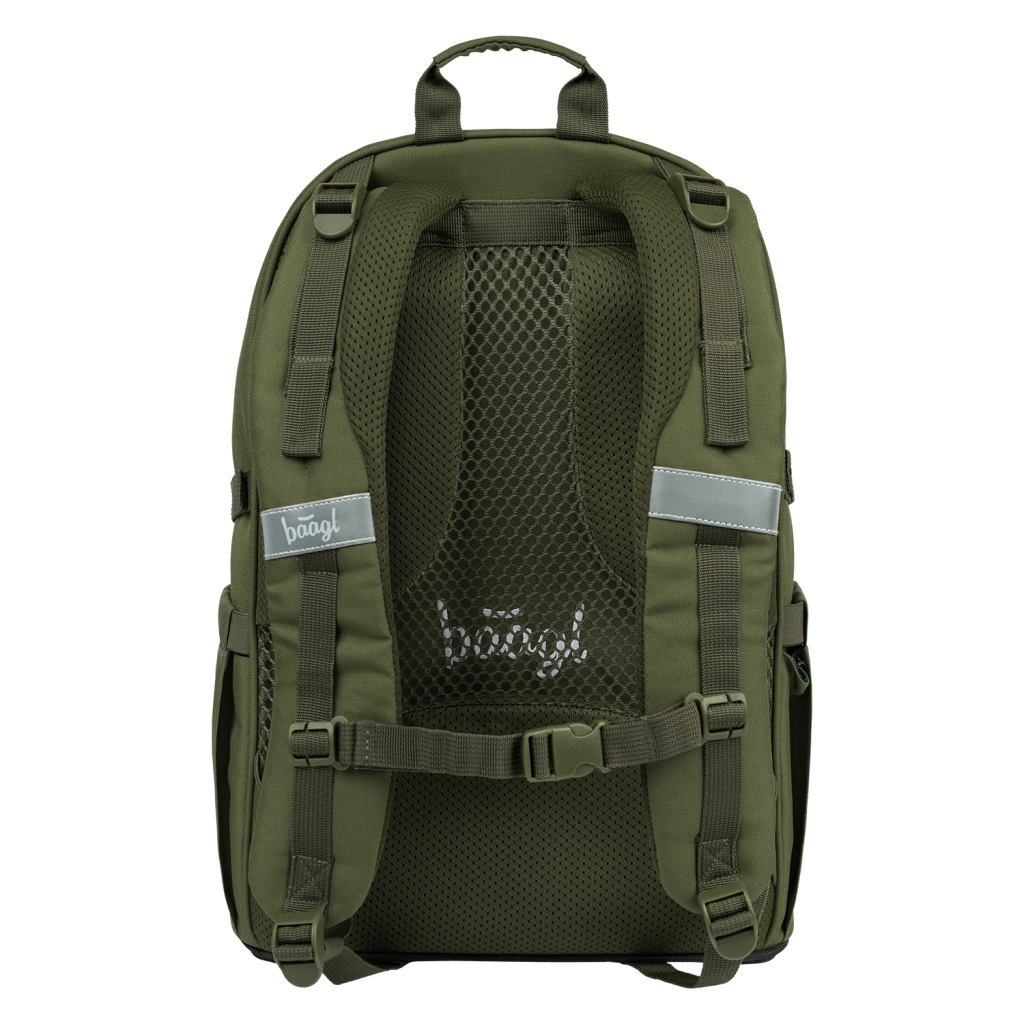 Il pratico set scolastico BAAGL Skate Olive combina attrezzatura leggera e resistente per alunni dalla 3ª classe della scuola primaria fino agli studenti. Il set include uno zaino ergonomico con fissaggio per skateboard, un capiente astuccio, una borsa sportiva pieghevole, un marsupio per l’essenziale e una custodia/organizer per accessori o notebook. Tutto è realizzato con materiali riciclati e idrorepellenti con elementi riflettenti e affidabili cerniere YKK, supportato da certificazione GRS.