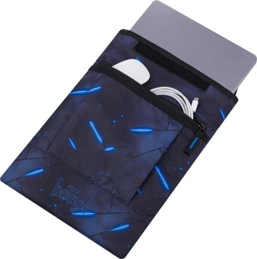 Grazie alla disponibilità di numerose grafiche, puoi abbinare facilmente la custodia ad altri accessori BAAGL. La tasca frontale ospita caricabatterie, mouse o cavi, così avrai tutto a portata di mano. Il materiale è conforme al Global Recycled Standard (GRS), a conferma della sua sostenibilità e della produzione responsabile.