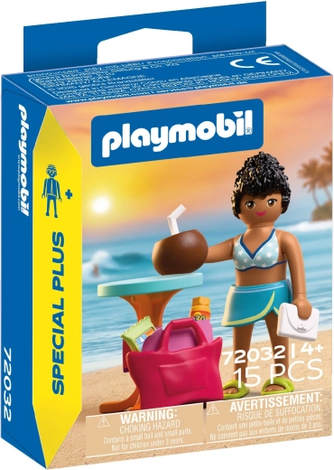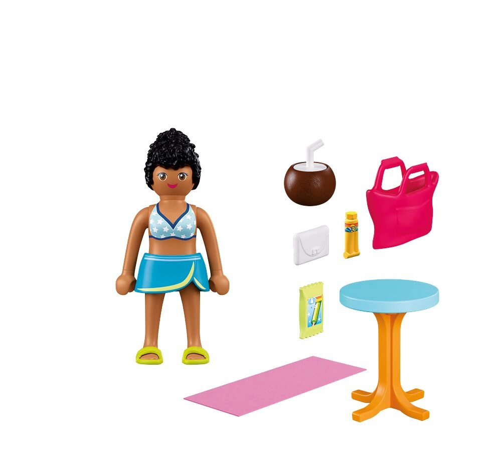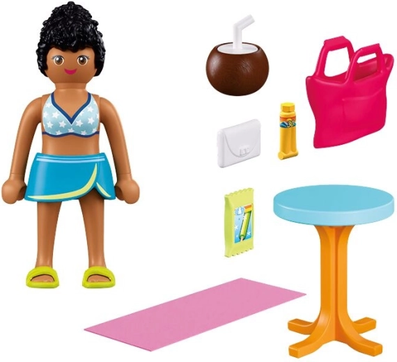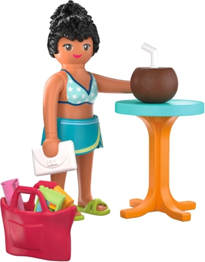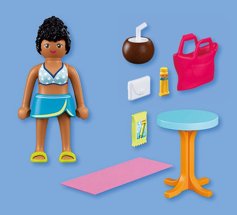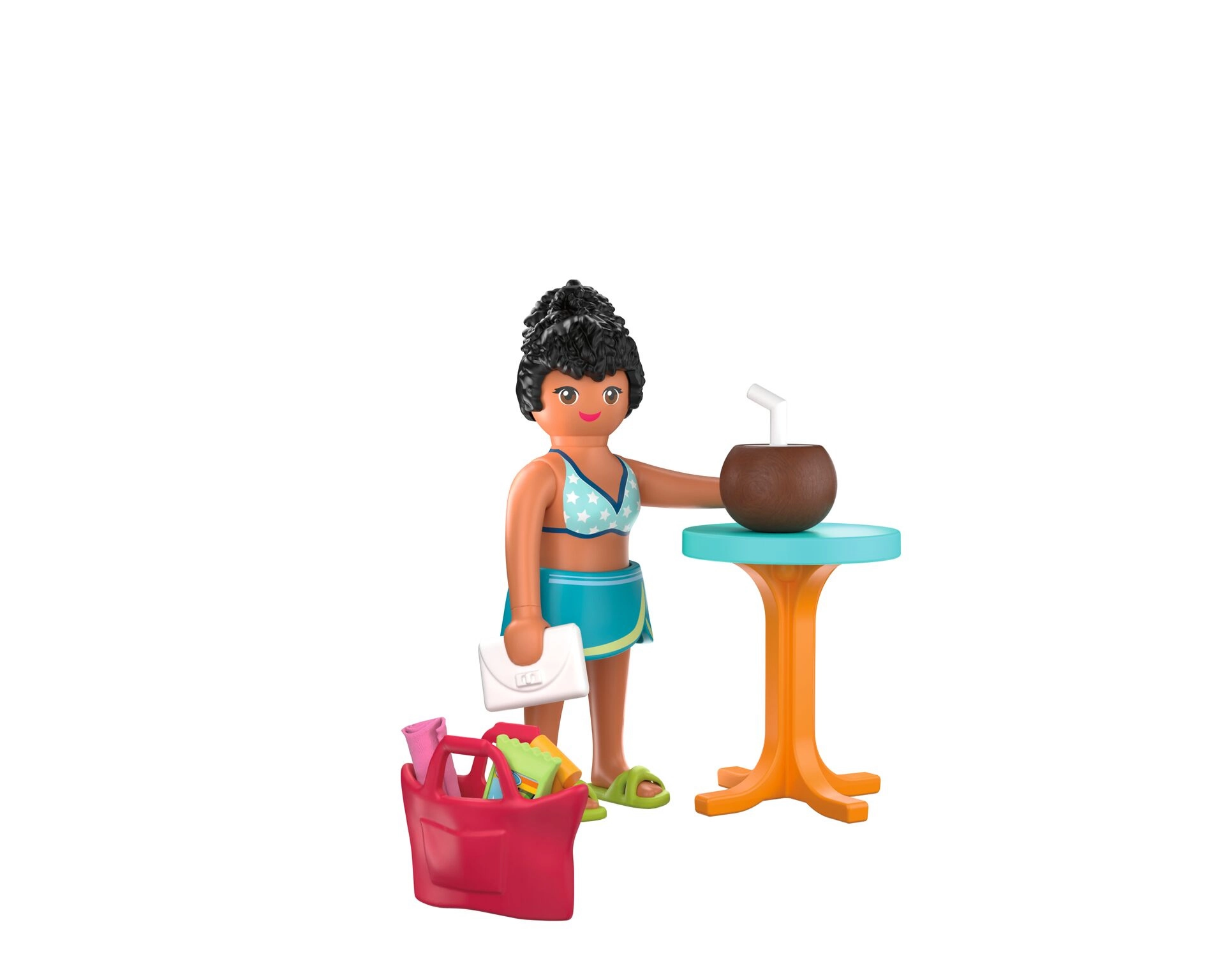 Questo set piccolo ma ben studiato di PLAYMOBIL porta l'atmosfera estiva direttamente nella cameretta. La figura della villeggiante (circa 7,5 cm) ha accessori eleganti e tutto l'occorrente per rilassarsi dopo una giornata di avventure in spiaggia – dal cocco allo snack rinfrescante.