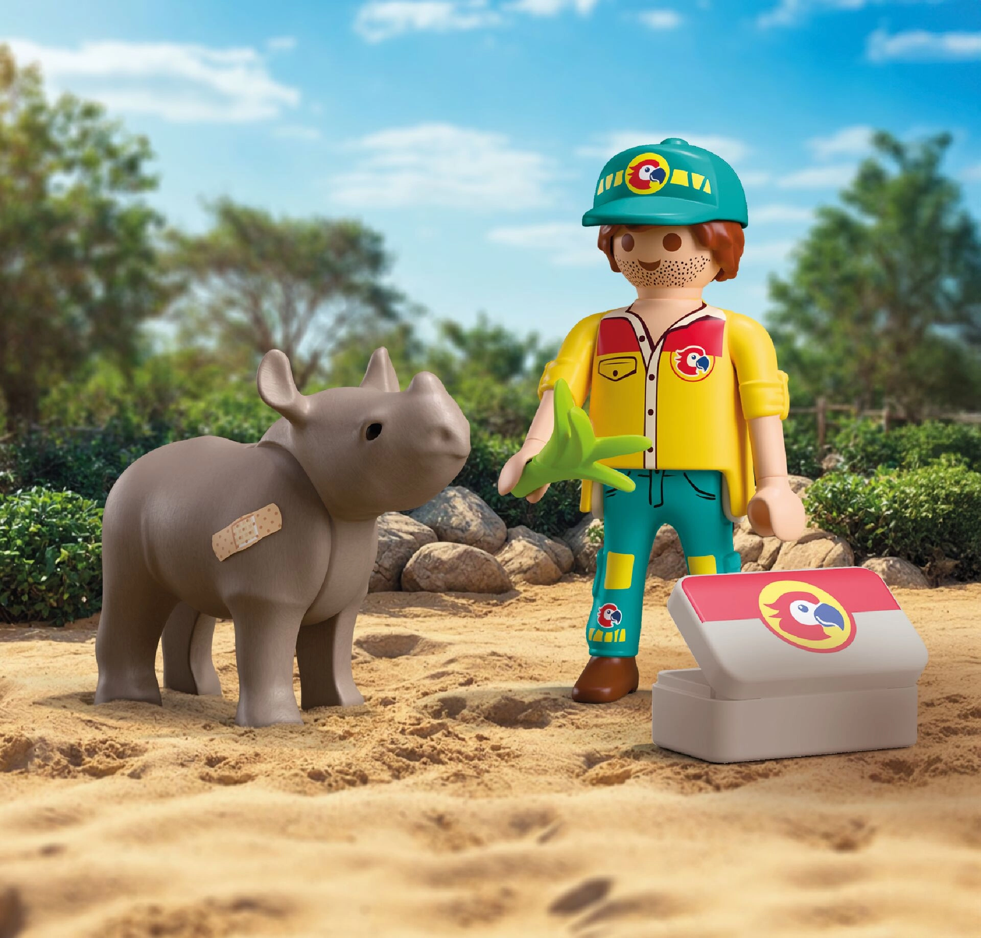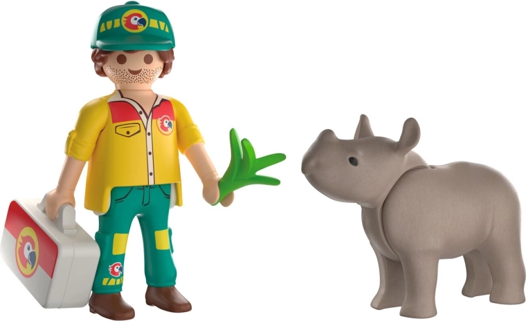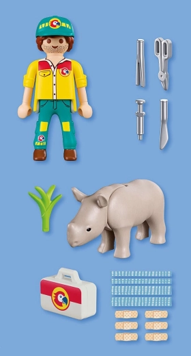 Entrate nel mondo PLAYMOBIL e aiutate il rinoceronte ferito a rimettersi in piedi. Questo set della linea Duo Pack offre due figure dettagliate e una selezione di accessori pratici con cui i bambini possono mettere in scena innumerevoli storie dallo zoo di Playmo-City. Strumenti e attrezzatura realistici sviluppano l'immaginazione e la sensibilità nella cura degli animali.