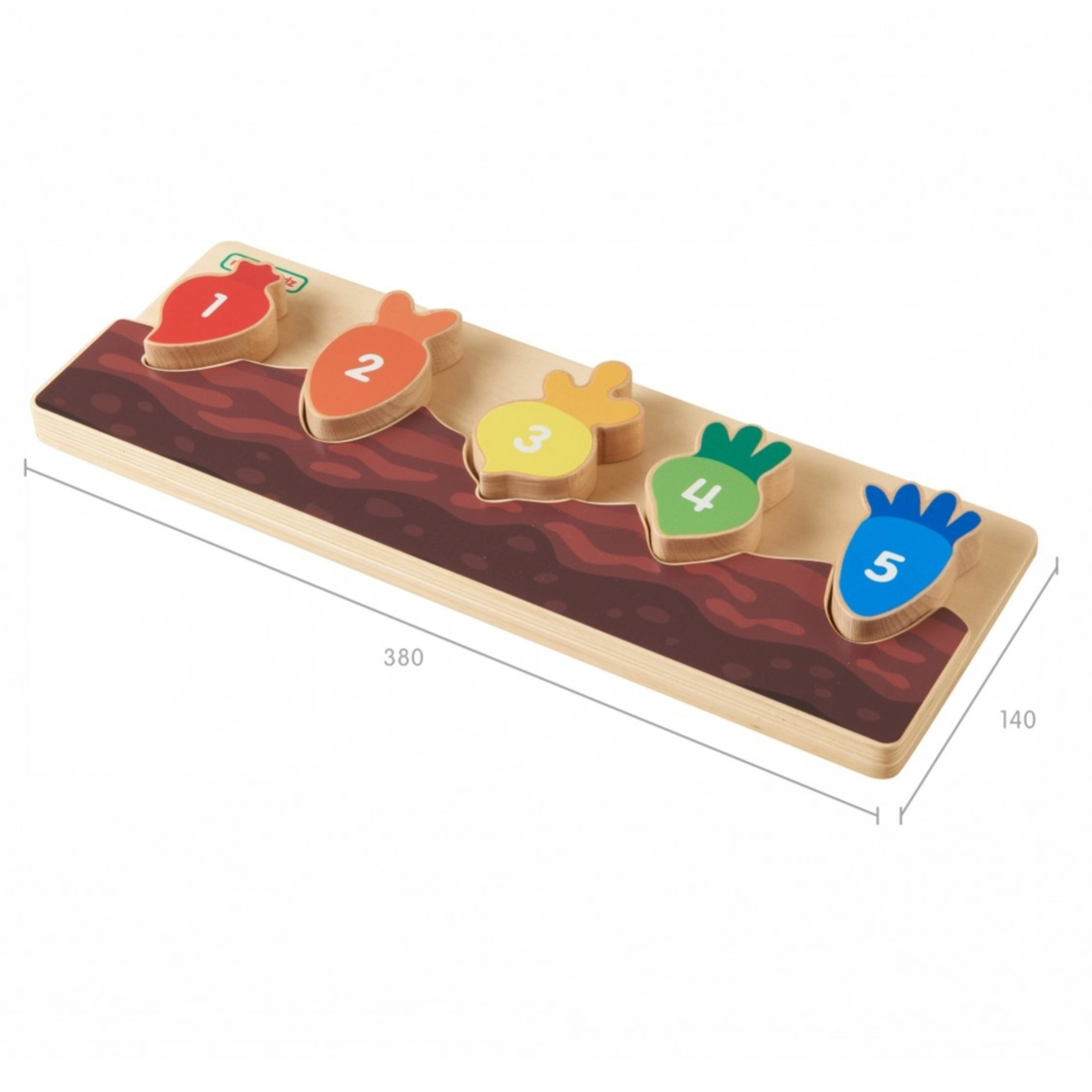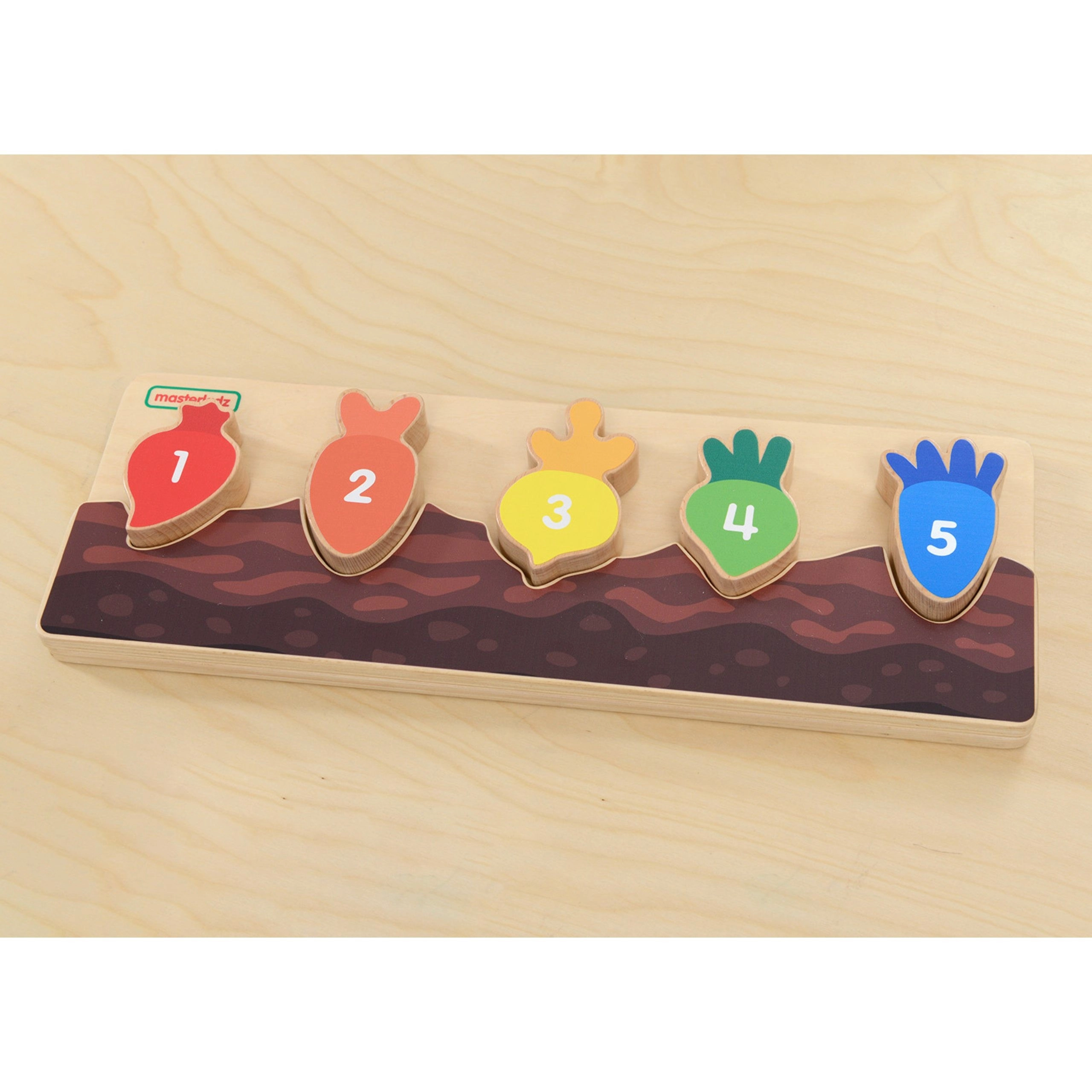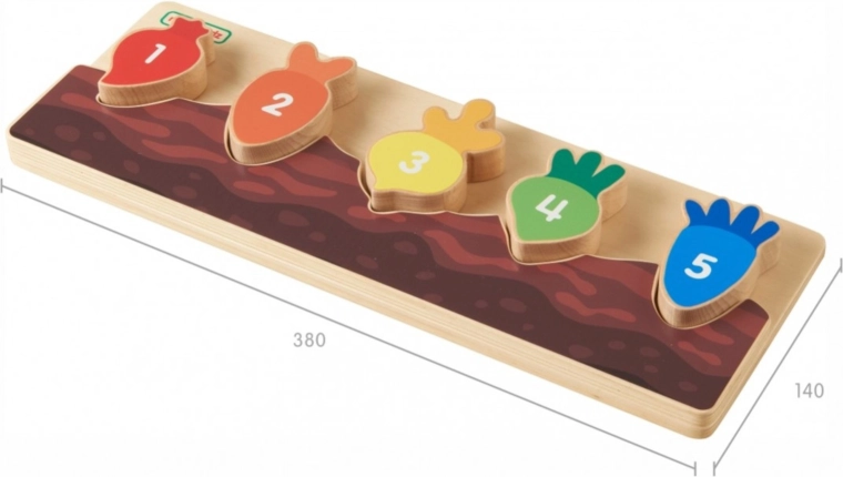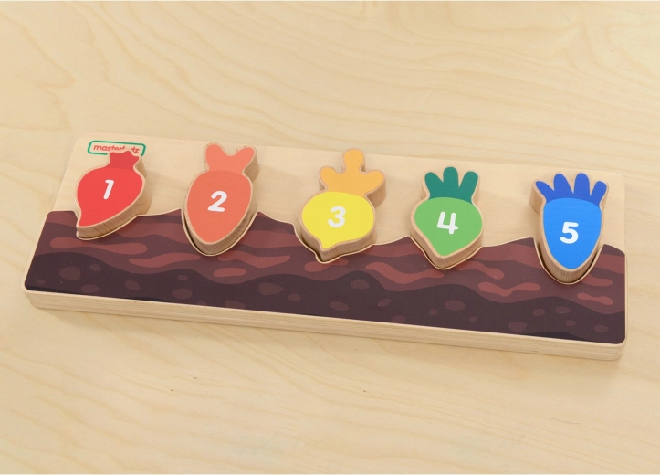 Ogni pezzo colorato di verdura è contrassegnato da un numero e si adatta solo al proprio intaglio. I bambini esercitano in modo naturale il conteggio e la sequenza 1–5.
