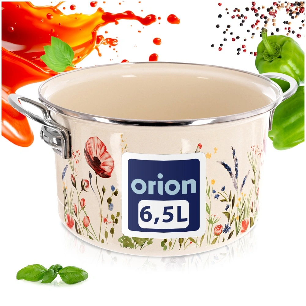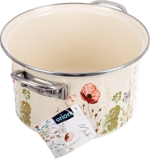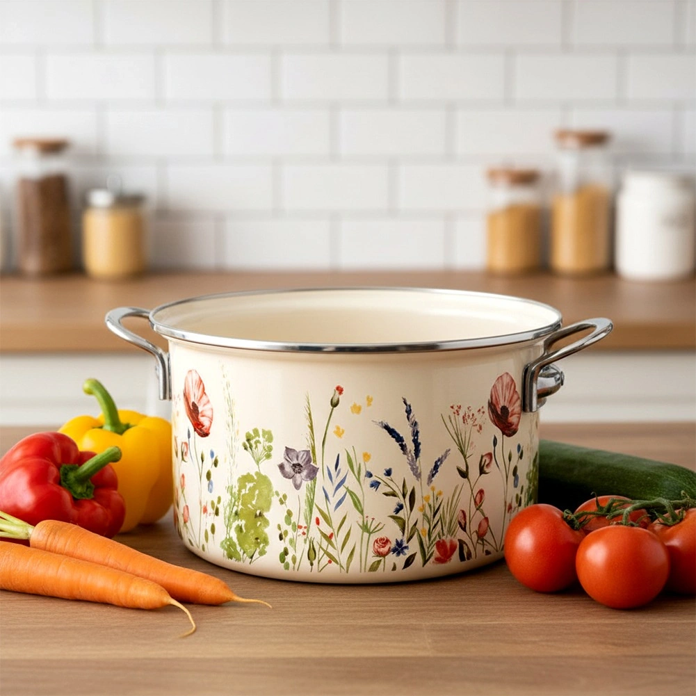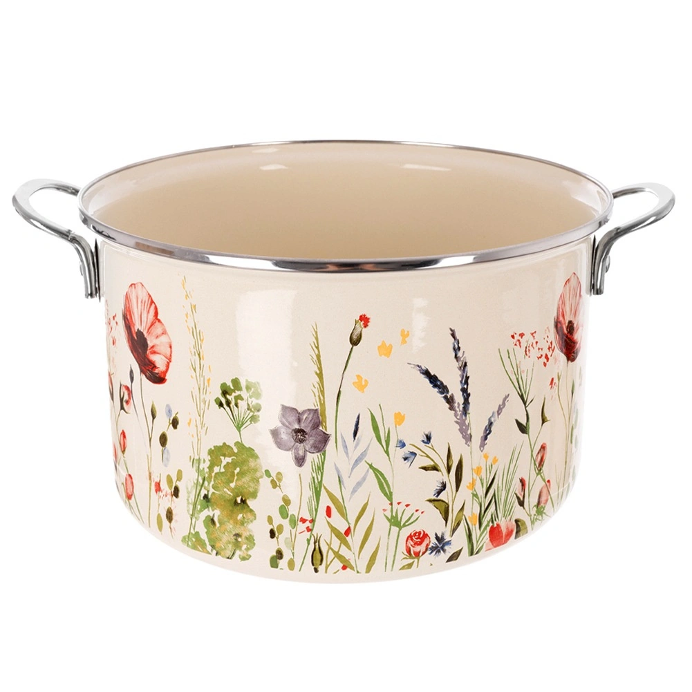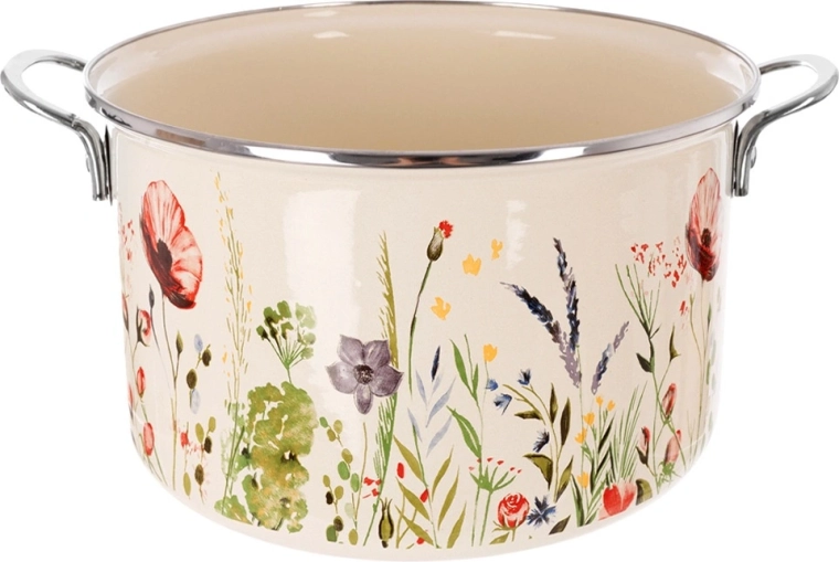 Elegante pentola smaltata di colore crema con motivo di fiori di campo, capacità 6,5 l e diametro 26 cm – ideale per zuppe, salse e stufati. Realizzata in acciaio smaltato di alta qualità con bordo e manici in acciaio inox per un trasporto sicuro. Adatta a tutti i tipi di piani cottura, compresa l’induzione, utilizzabile anche in forno e lavabile in lavastoviglie. Il materiale è sicuro per la salute ed è adatto anche agli allergici.