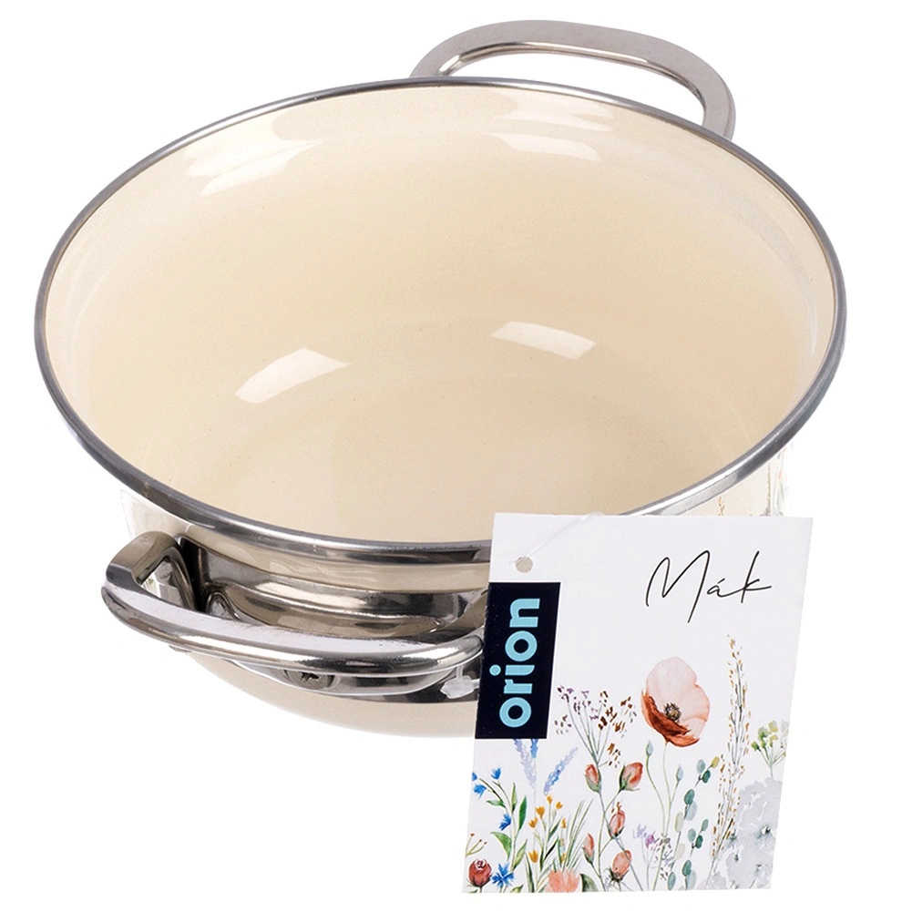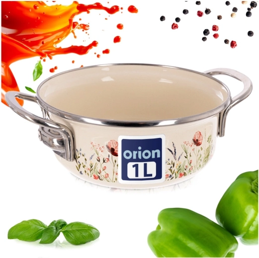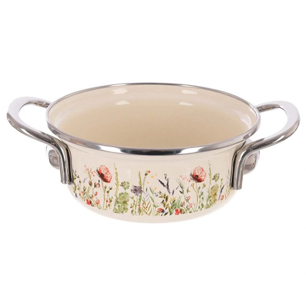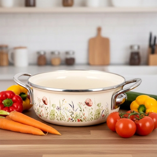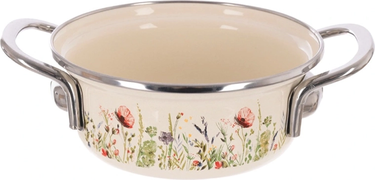Look tradizionale, funzionalità moderna. Questa pentola color crema con rivestimento smaltato e bordo in acciaio inox distribuisce il calore in modo eccellente, è resistente alla corrosione e facile da pulire. Il decoro con fiori di prato dona alla tua cucina un tocco di stile retrò, mentre il pratico volume di 950 ml è ideale per salse, zuppe o porzioni rapide per una o due persone.