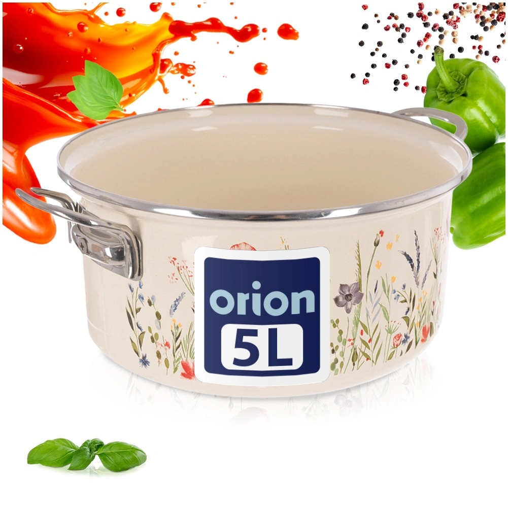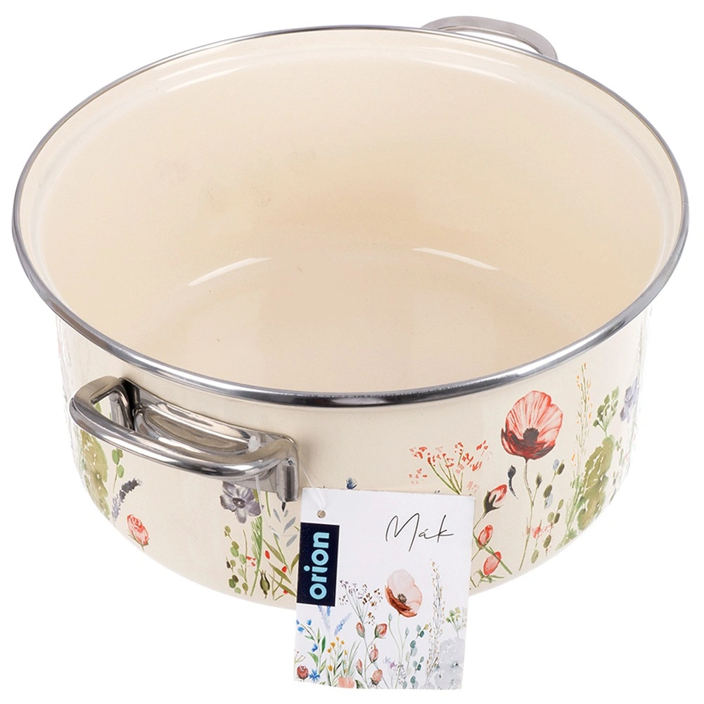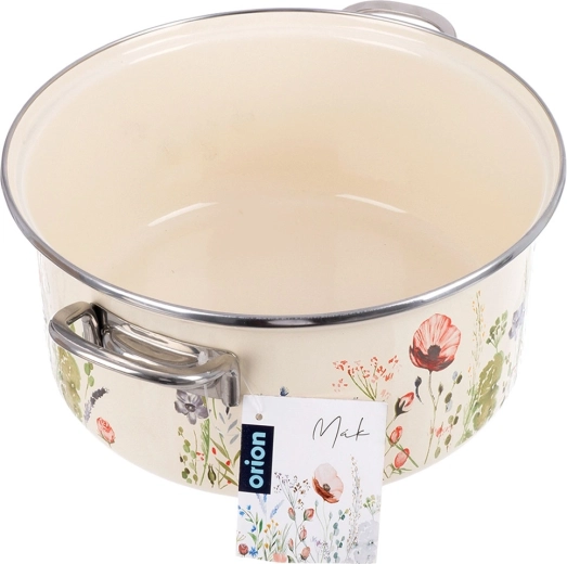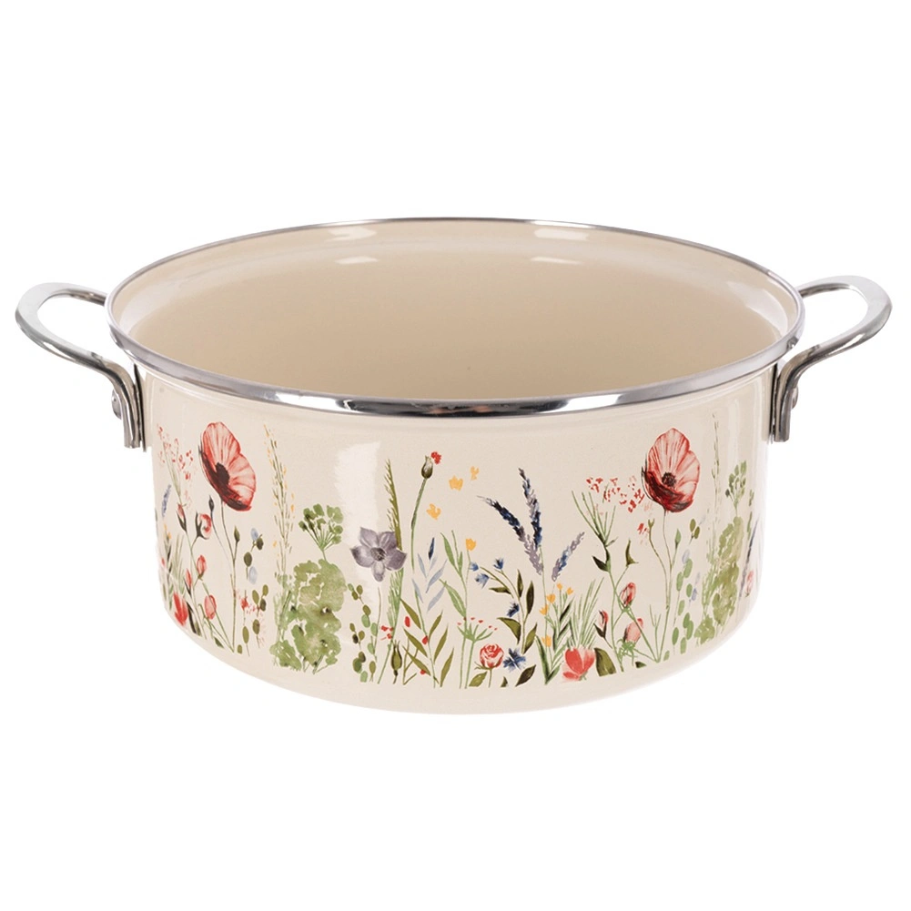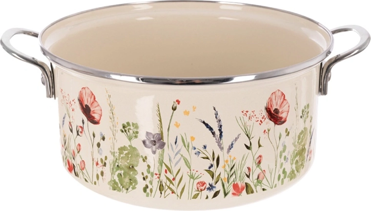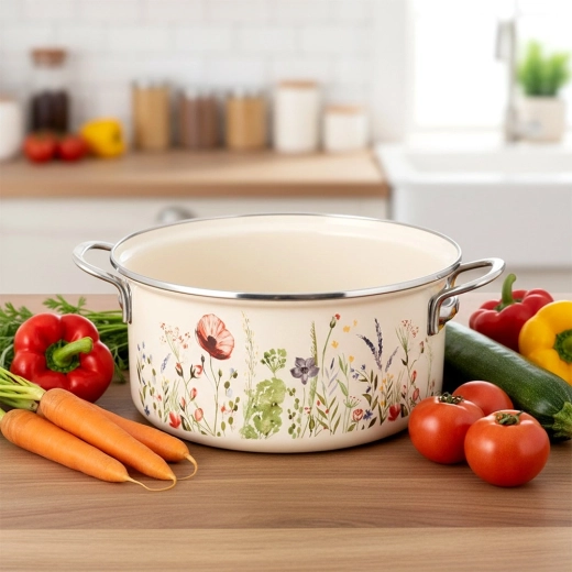La popolare pentola in stile retrò unisce la robustezza dello smalto alla praticità quotidiana. Capienza 5 l, diametro 26 cm e altezza 12 cm offrono spazio sufficiente per zuppe, salse e porzioni familiari. La finitura color crema con decoro floreale abbellisce cucina e tavola, così da poter servire le pietanze direttamente al suo interno.
