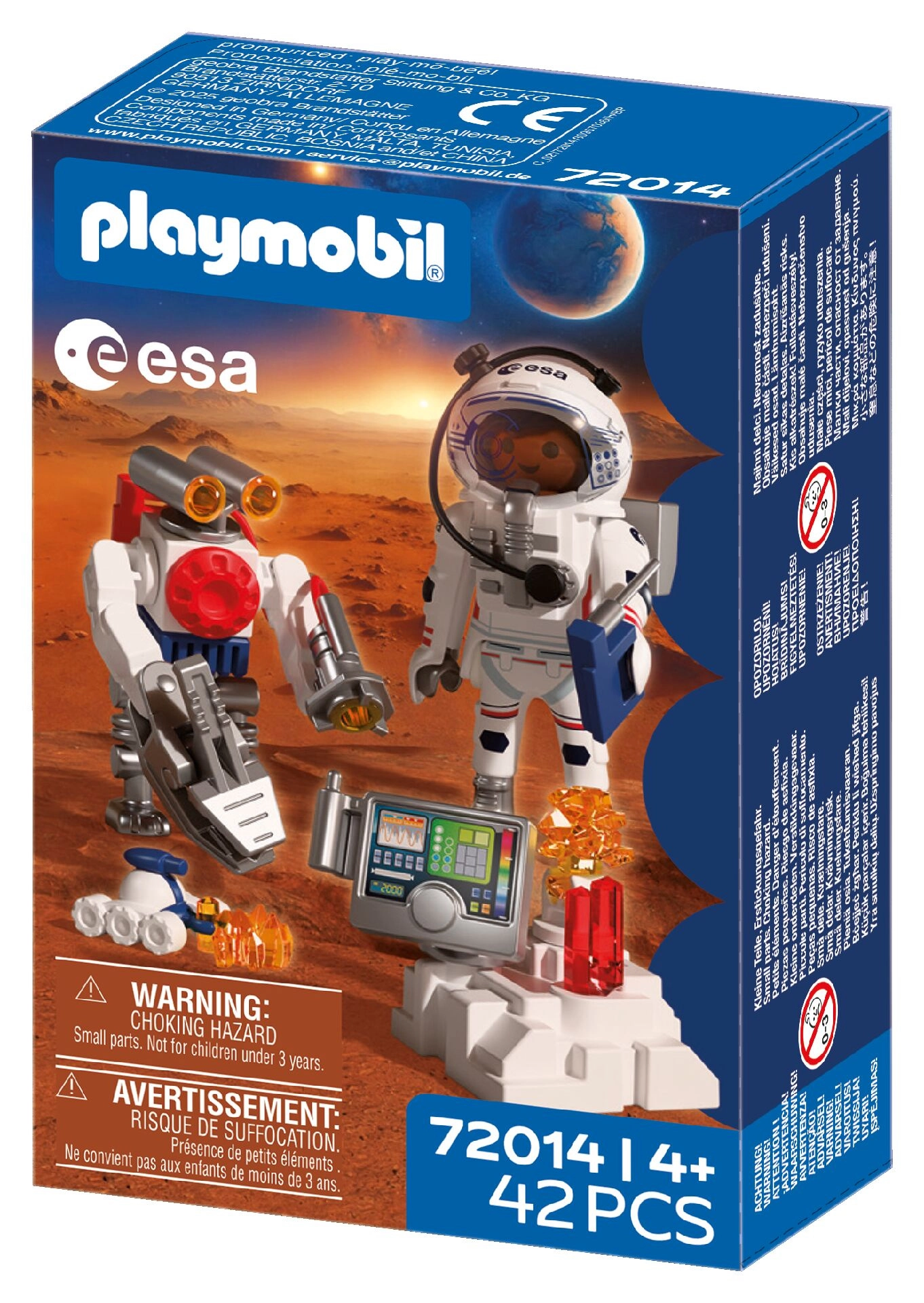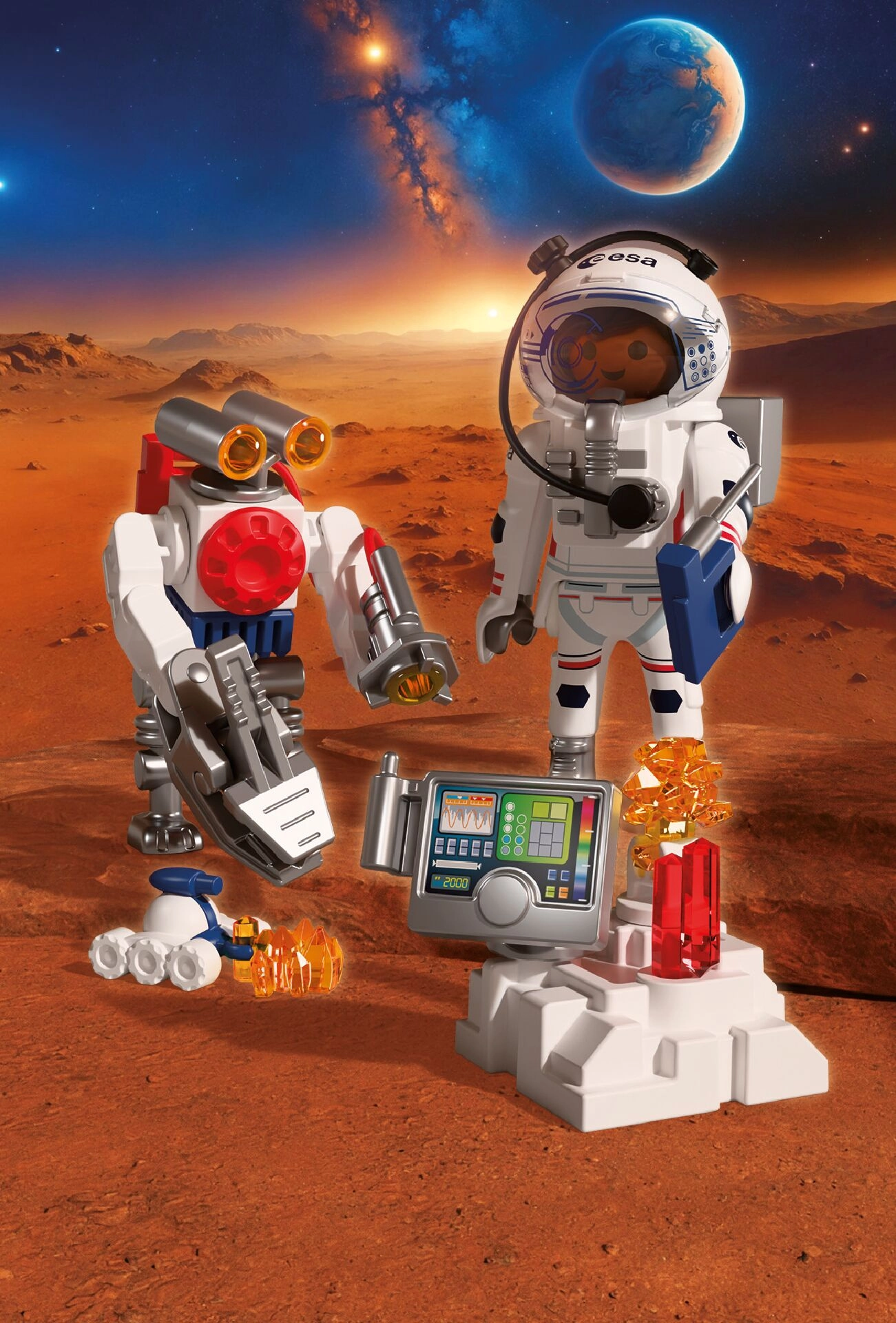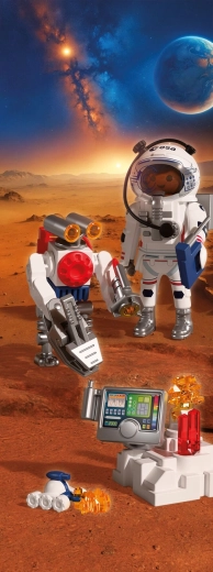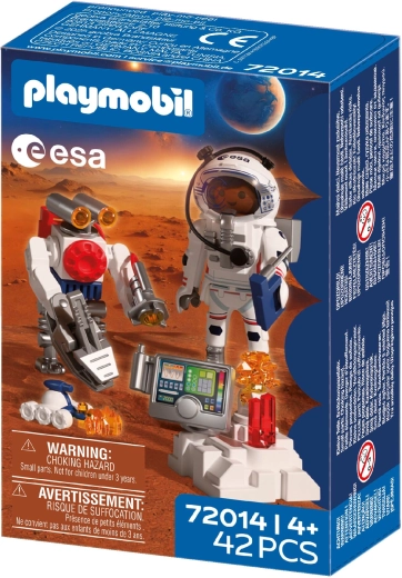 Vivi un’autentica avventura spaziale con PLAYMOBIL in collaborazione con l’ESA. L’astronauta, con l’aiuto di un robot agile e di un rover versatile, esplora la superficie del Pianeta Rosso, raccoglie campioni di suolo e intercetta misteriosi segnali provenienti dall’interno di Marte.