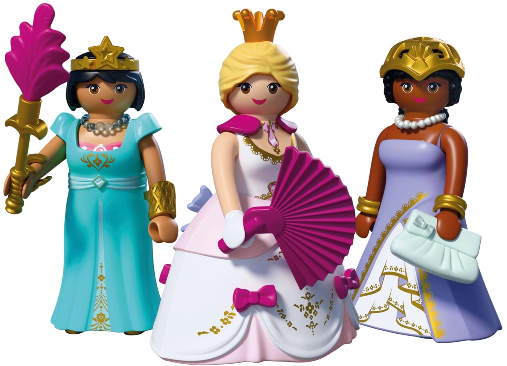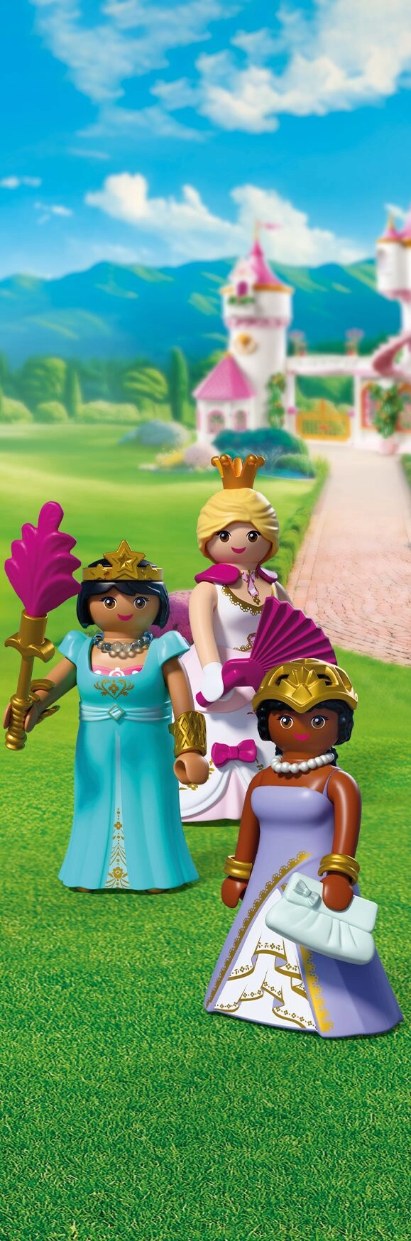 Tre incantevoli principesse invitano i bambini in un mondo di avventure regali. Grazie agli abiti, gonne e gioielli intercambiabili, i piccoli creatori possono cambiare facilmente l’aspetto delle figure e inventare sempre nuove storie – dal gran ballo alle passeggiate nei giardini del castello.