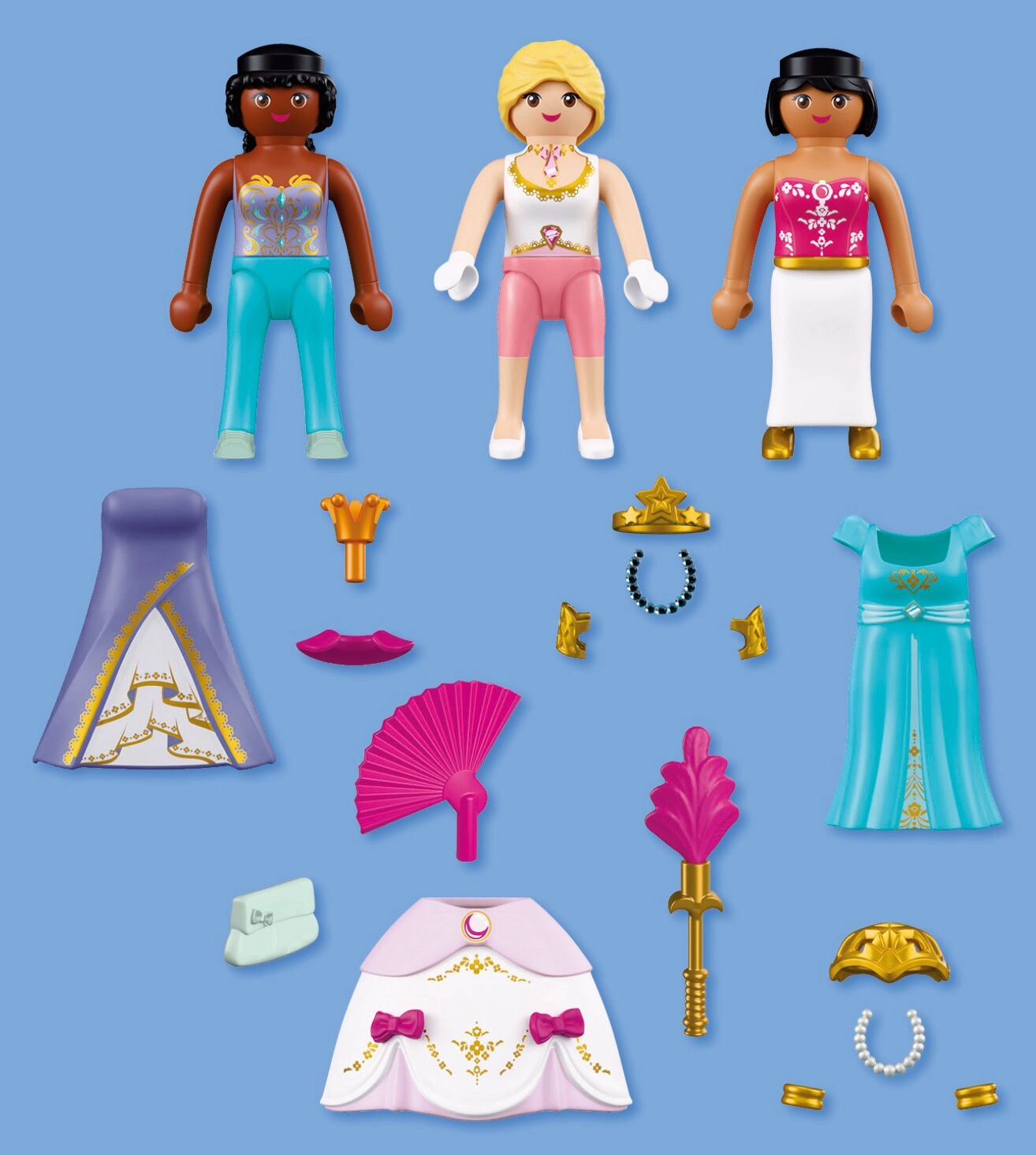 - Contenuto della confezione: 3 figure di principesse (circa 7,5 cm), 2 abiti, gonna, corona, corona con stella, reticella per capelli, ventaglio, colletto, 2 collane, scettro con piuma, 2 bracciali, 2 polsini