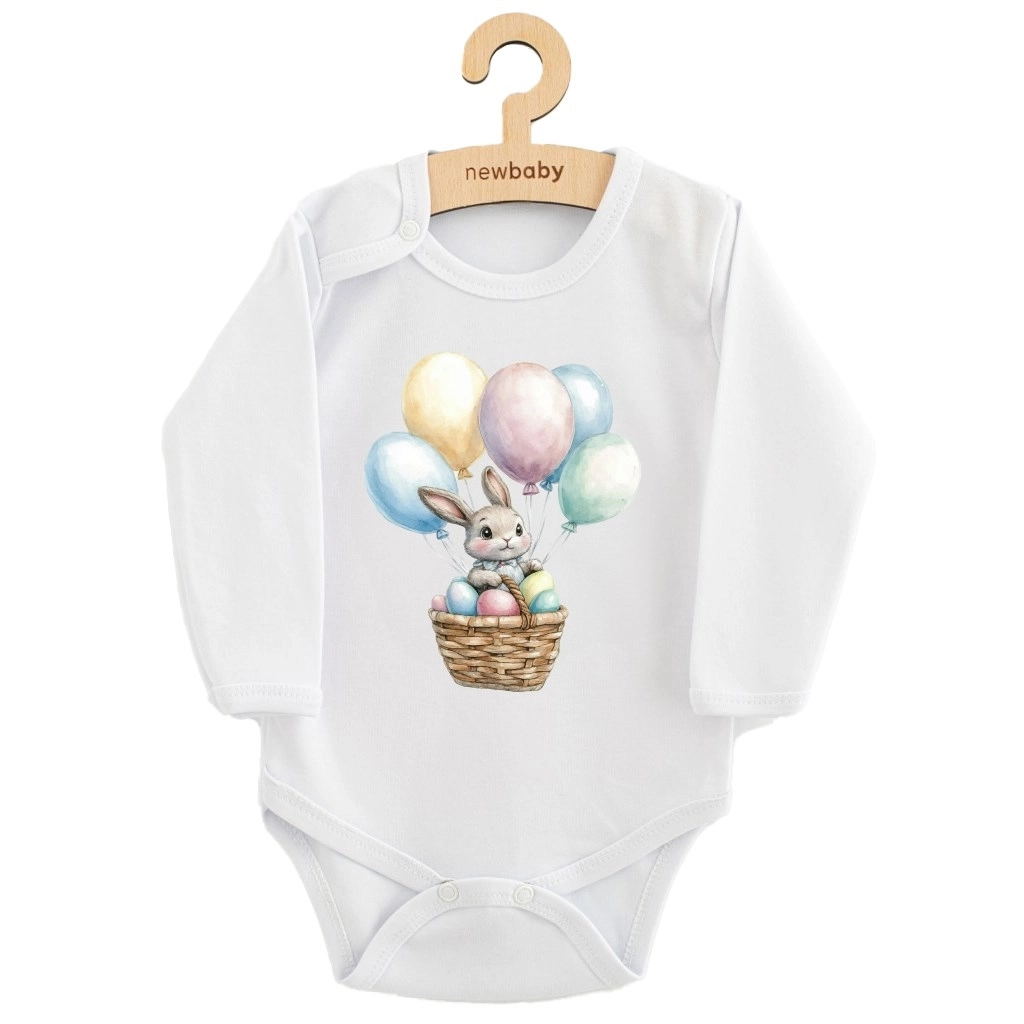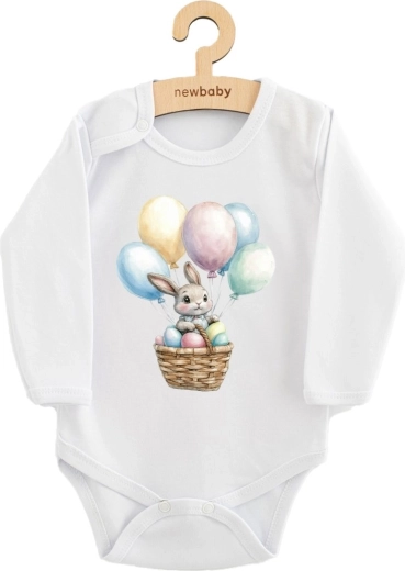 Questo body bianco a manica lunga con il delicato motivo del coniglietto nel cestino con palloncini pastello è una scelta perfetta per il corredino o come regalo per la nascita. Il materiale in cotone 100% naturale garantisce comfort per tutto il giorno, libertà di movimento e un tocco gentile sulla pelle di neonati e bimbi piccoli.