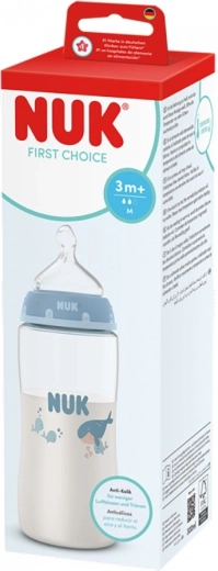 Il pratico biberon NUK First Choice con controllo della temperatura facilita un'alimentazione sicura: l'indicatore cambia colore da blu a bianco quando il contenuto è troppo caldo. La bottiglia in resistente polipropilene senza BPA è leggera, piacevole al tatto e, grazie alla tettarella ortodontica anti-colica, imita l'allattamento naturale. Capacità 300 ml, adatta da 3 mesi, misura M per pappe e latte. Clinicamente testato e compatibile con tutti i prodotti NUK First Choice.