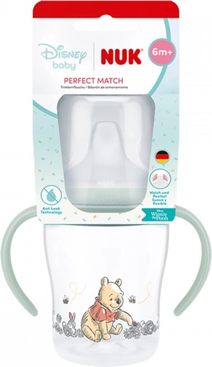 Il biberon per l’apprendimento NUK Perfect Match con il motivo DISNEY Winnie the Pooh da 150 ml aiuta i bambini a passare in modo naturale dal biberon alla tazza. Dispone di un beccuccio eccezionalmente morbido ed elastico con ampia appoggio per le labbra, manici ergonomici antiscivolo per una presa facile, tecnologia Anti‑Leak anti‑perdita e indicatore di temperatura per servire le bevande in sicurezza. Prodotto in Germania con materiali di alta qualità.