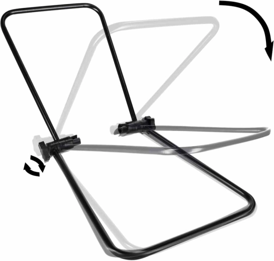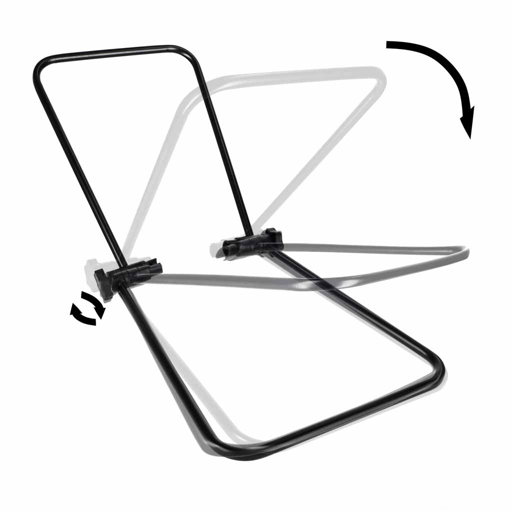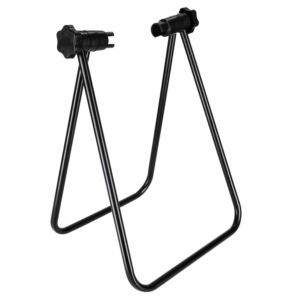 Dopo l'uso, il cavalletto si ripiega facilmente in dimensioni compatte, una caratteristica apprezzabile in appartamenti piccoli, garage e officine. Il design universale è adatto a un'ampia gamma di biciclette e le superfici di contatto in gomma proteggono il telaio e il mozzo.