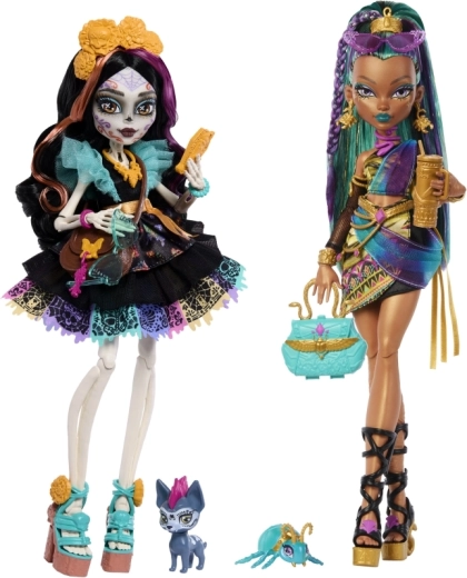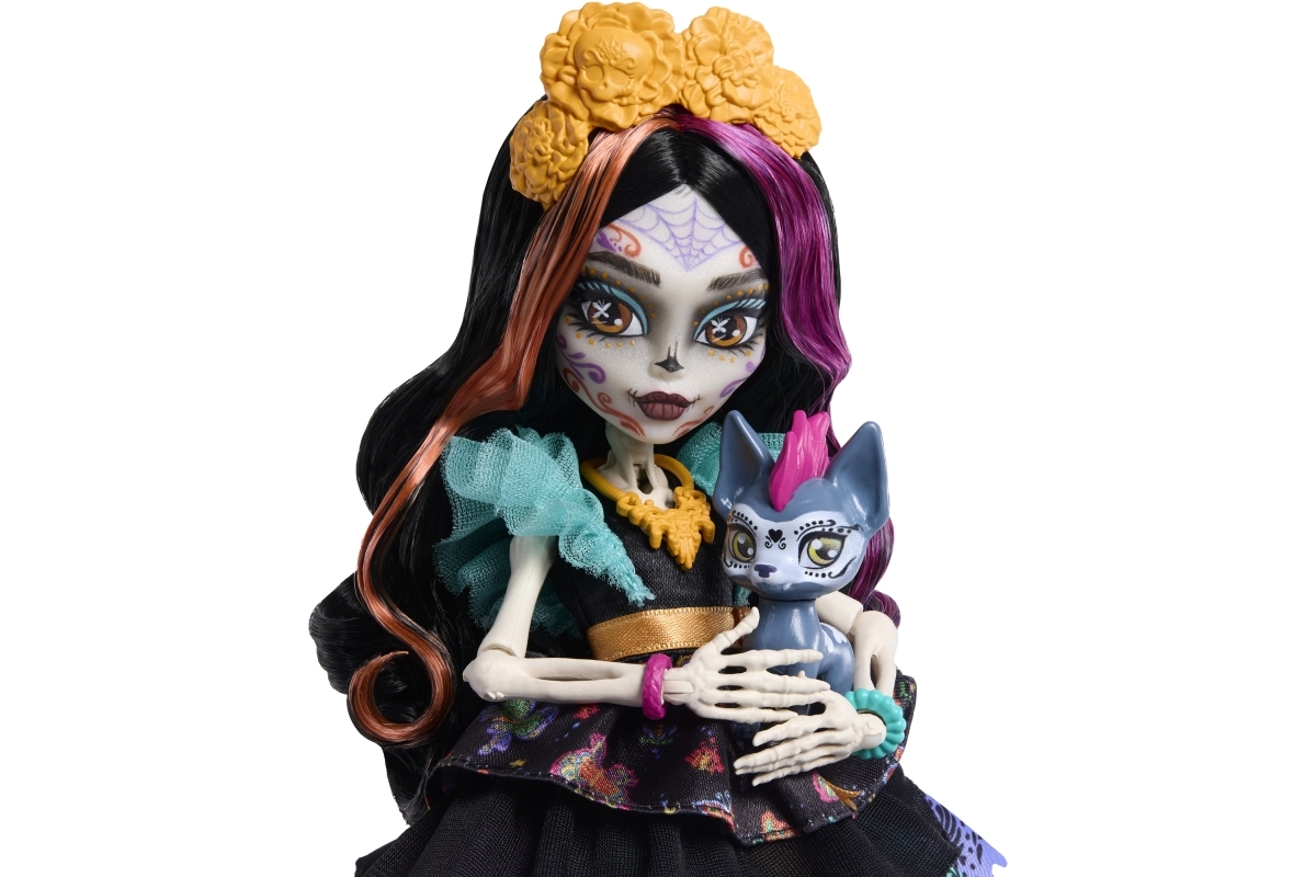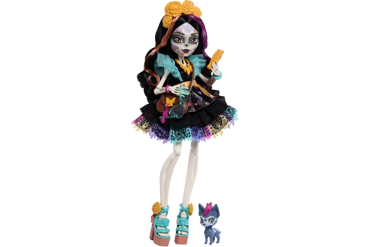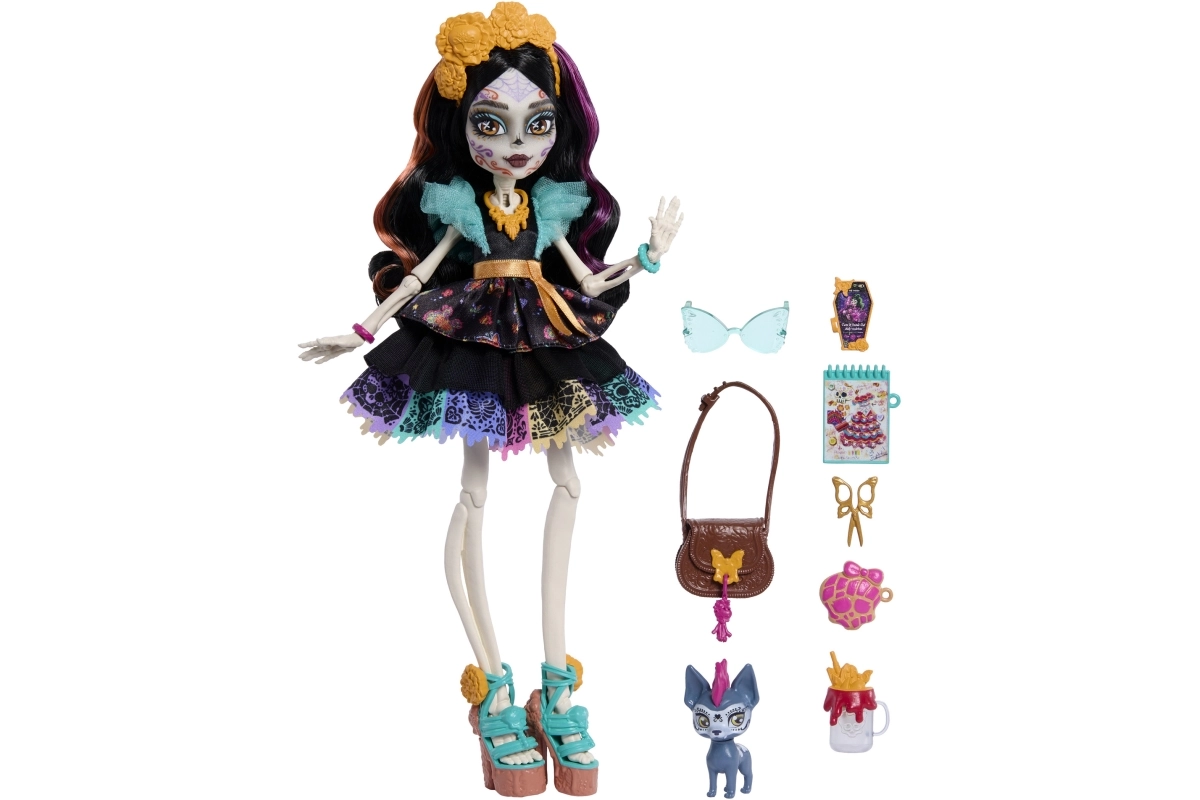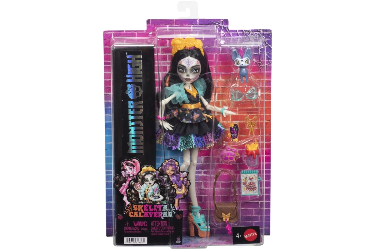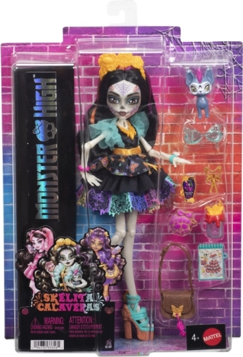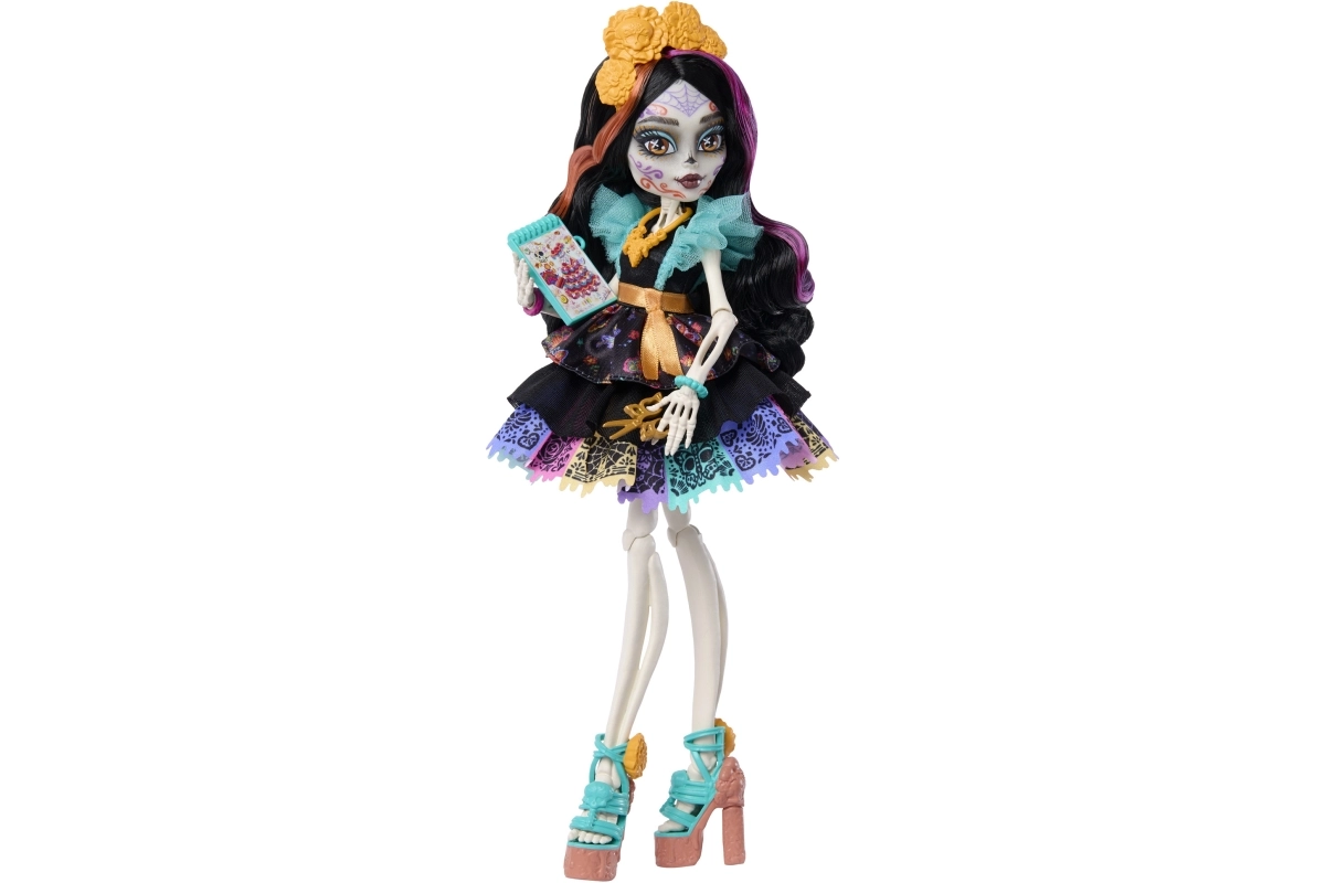 Skelita Calaveras porta nel mondo di Monster High un look unico ispirato al Día de los Muertos. Grazie al trucco deciso, agli abiti lavorati nei minimi dettagli e ai tanti accessori colorati, i bambini si divertiranno per ore con giochi fantasiosi. Le articolazioni mobili permettono di posare con facilità e creare proprie scene di moda.