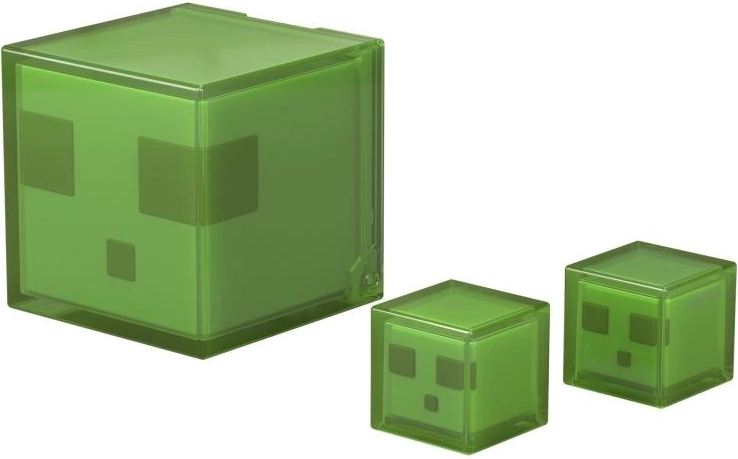 Slime verdi traslucidi con volti pixelati da impilare ed esporre. Le diverse dimensioni danno vita ai tuoi diorama e alle scene d'azione.