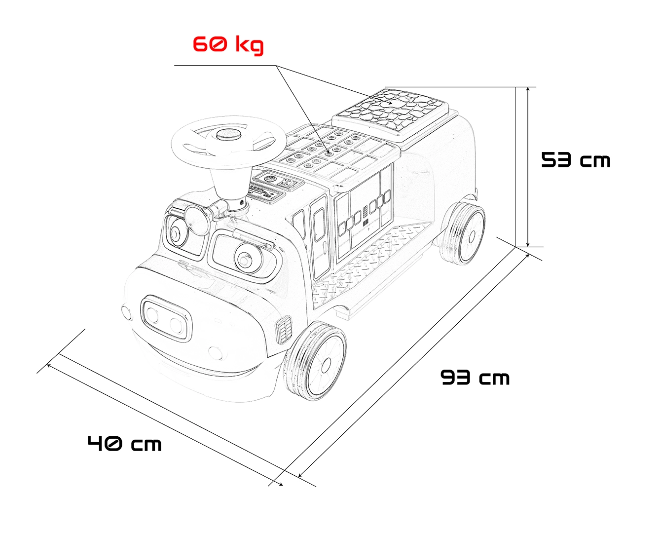 - Lunghezza 93 cm; larghezza 40 cm; altezza 53 cm