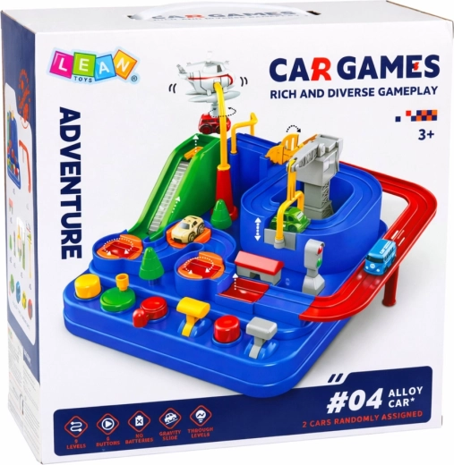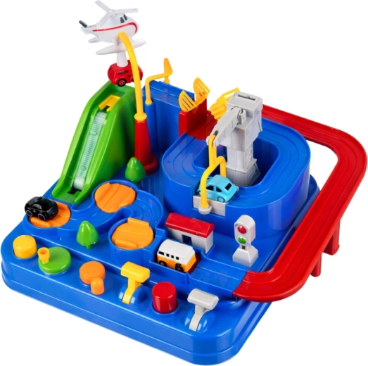 Divertente pista automobilistica interattiva con ostacoli e pannello di comandi che offre ai bambini ore di gioco creativo. Con pulsanti e leve i bambini controllano il ponte, ascensore/sottopasso, cambio di direzione e la gru, guidando i veicoli in sicurezza fino al traguardo. Inclusi 4 veicoli (autobus, polizia, pompieri, auto) e un elicottero. La struttura resistente in plastica di alta qualità favorisce motricità fine, coordinazione mano–occhio e pensiero logico.