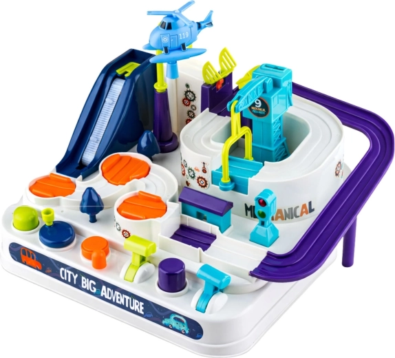 Ascensore, ponte, gru, piattaforme girevoli e strade tortuose creano un percorso variegato che sviluppa logica, coordinazione e pazienza nei bambini.