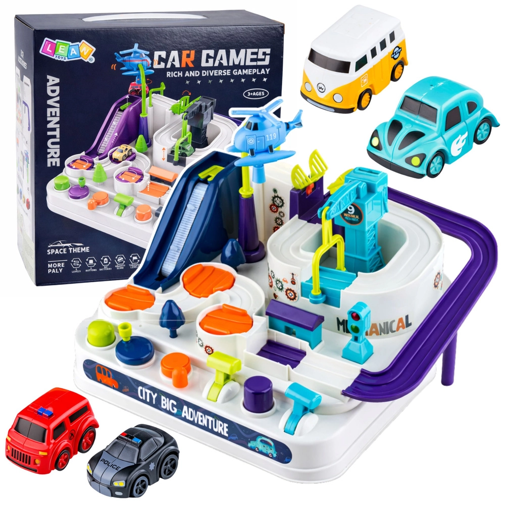 Scopri un gioco divertente ed educativo che unisce pensiero logico, motricità fine e gioco attivo senza batterie. Il set interattivo di pista con ostacoli e parcheggio offre controllo meccanico con pulsanti e leve, numerose curve, ponti e ascensori e include inoltre 4 macchinine e un elicottero per ore di gioco creativo.