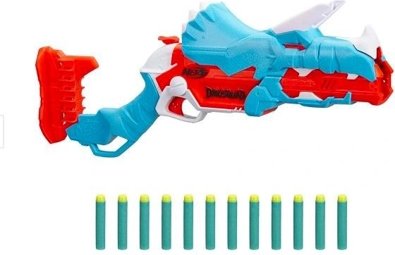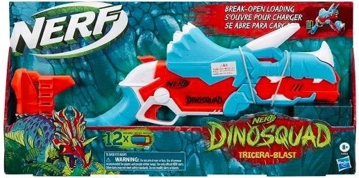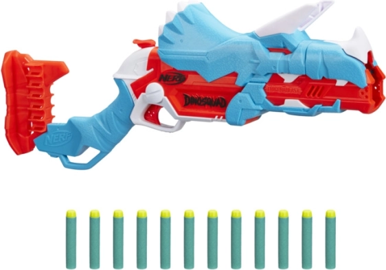 Il blaster è stilizzato come il popolare dinosauro Triceratopo. Il suo design unico offre divertimento nel mondo dei dinosauri, che i bambini adorano.