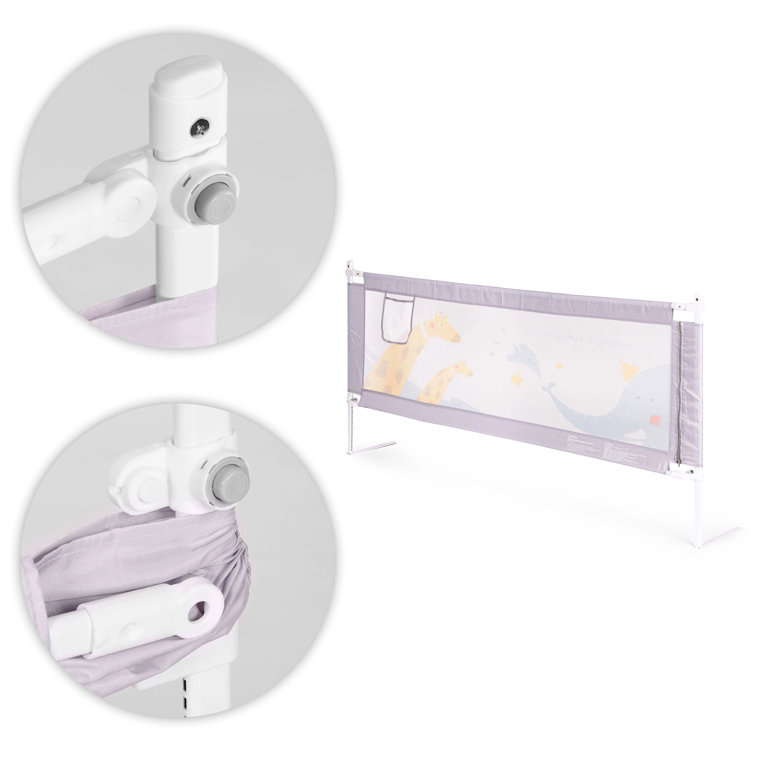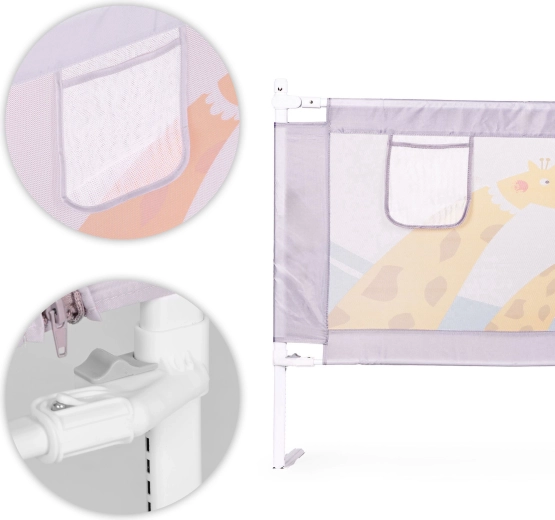 Grazie al montaggio universale e alla possibilità di collegare più barriere, crei facilmente uno spazio sicuro e accogliente su qualsiasi lato del letto. I materiali resistenti (acciaio, tessuto Oxford 210D, poliestere) garantiscono lunga durata e manutenzione facile: il rivestimento è removibile e lavabile. Il discreto motivo animale si integra nella cameretta e la tasca per ciuccio, salviette o giochini mantiene tutto a portata di mano.