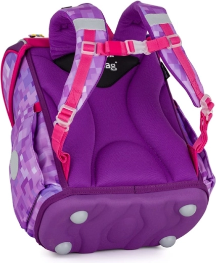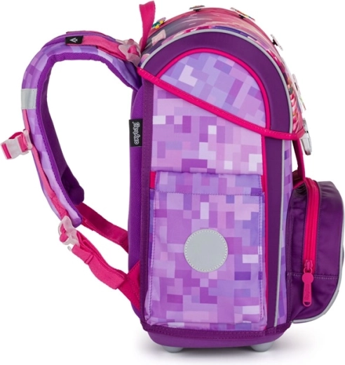 Elegante cartella scolastica con motivo pixel art in tonalità di viola e rosa, dotata di schienale ergonomico, struttura rigida e chiusura di sicurezza in metallo con elemento riflettente. Grazie a un unico scomparto spazioso, alla tasca frontale per la merenda e ai elementi riflettenti, è ideale per gli alunni di 1ª–2ª classe.