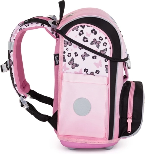 Il vano principale contiene libri, quaderni e cartelline per bambini della 1ª–2ª classe. La taschina frontale è ideale per la merenda e le tasche laterali sono utili per piccoli oggetti. Il fondo rigido con piedini protegge il contenuto dal ribaltamento e dalla fuoriuscita, mentre gli elementi riflettenti aumentano la visibilità del bambino durante il tragitto da e verso la scuola.