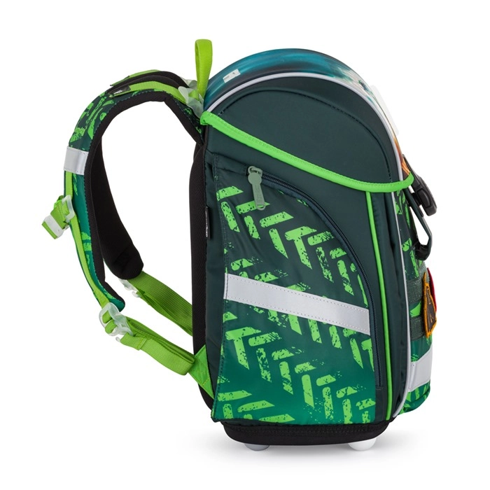 Per un trasporto sicuro e stabile, lo zaino è dotato di cinturino pettorale e cinghie di richiamo del carico, oltre a ganci aggiuntivi per un facile fissaggio. Gli elementi riflettenti migliorano la visibilità del bambino al crepuscolo e al buio. La chiusura magnetica consente un’apertura rapida e semplice, mentre il divisorio interno e le numerose tasche mantengono libri, quaderni e piccoli oggetti ben al loro posto.