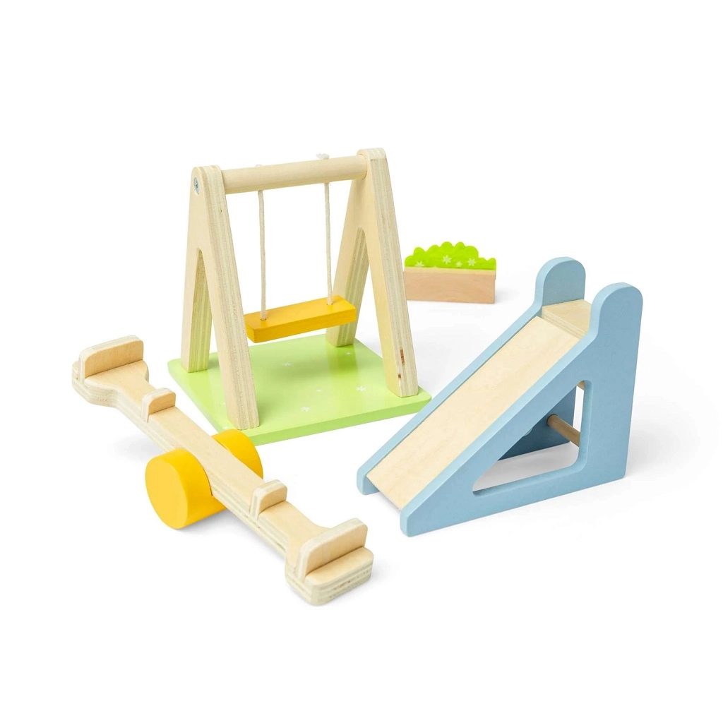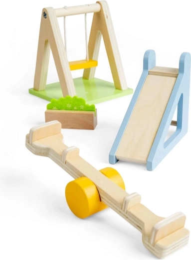 Trasforma il giardino della tua casa delle bambole in un luogo pieno di movimento e fantasia. Il set include gli elementi più amati del parco giochi: altalena, scivolo, bilico (see-saw) e una decorativa aiuola fiorita. Grazie ai componenti in legno levigati, con delicate tonalità pastello, la manipolazione è piacevole e sicura.