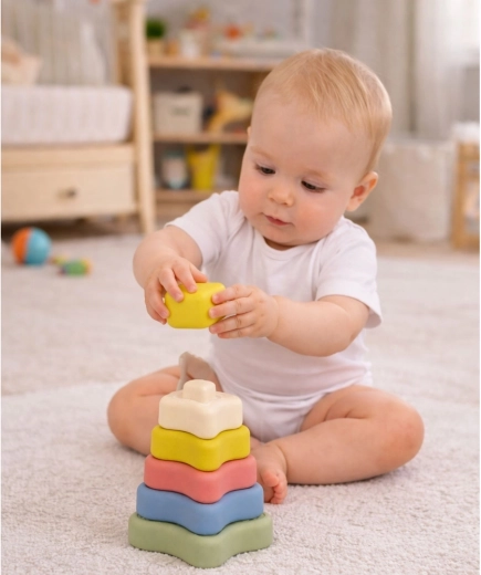 Tonalità delicate e la forma giocosa delle stelline attirano l’attenzione e incoraggiano i bambini a esplorare in autonomia e a impilare in modo creativo.