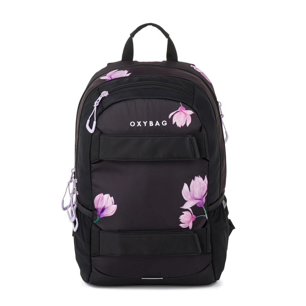 Il set OXY Sport Flowers combina funzionalità e design. Lo zaino ha due scomparti principali e una tasca frontale con cerniere robuste, all’interno un vano rinforzato per laptop, moschettone per chiavi, tasche più piccole per accessori e una tasca posteriore nascosta. Per il comfort quotidiano non mancano la tasca laterale per la bottiglia, gli spallacci imbottiti e la cinghia pettorale per la stabilità. L’astuccio con cerniera ed elastico mantiene in ordine il materiale di scrittura.