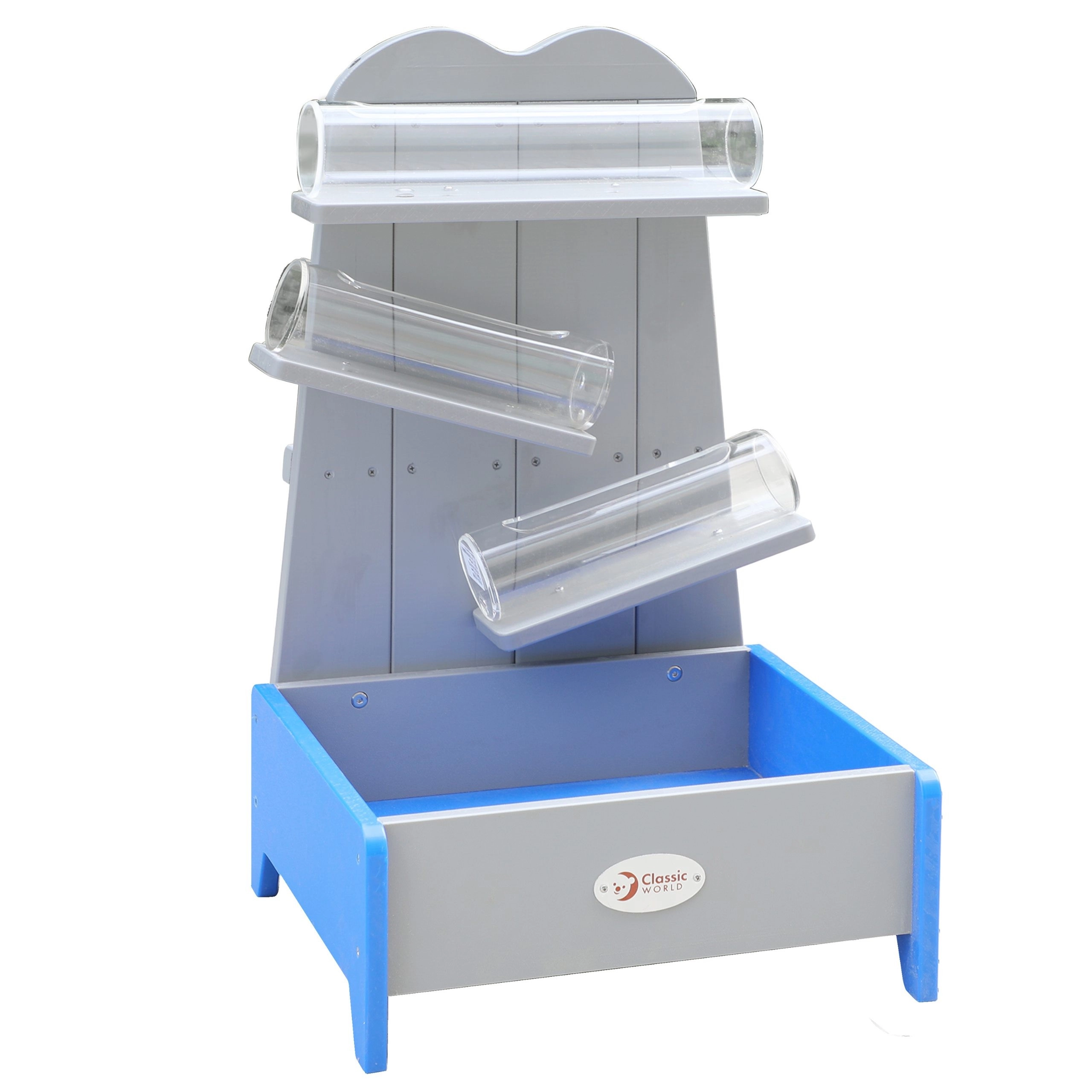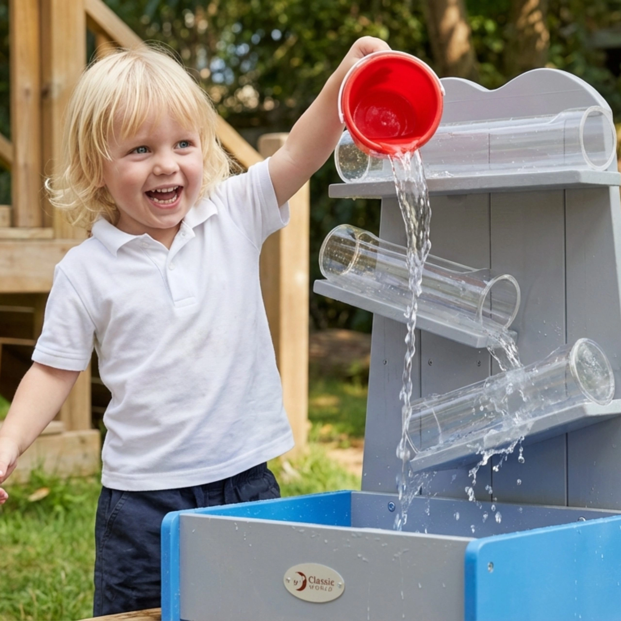 Cascata d’acqua in legno CLASSIC WORLD trasforma il giardino in un ludico laboratorio scientifico. I bambini versano l’acqua nella parte superiore e osservano come scende a cascata attraverso le tubazioni trasparenti fino alla vaschetta blu. La struttura in legno stabile, i materiali resistenti e il circuito chiuso dell’acqua favoriscono l’esplorazione sensoriale, la logica e le abilità di coordinazione per bambini dai 3 anni.