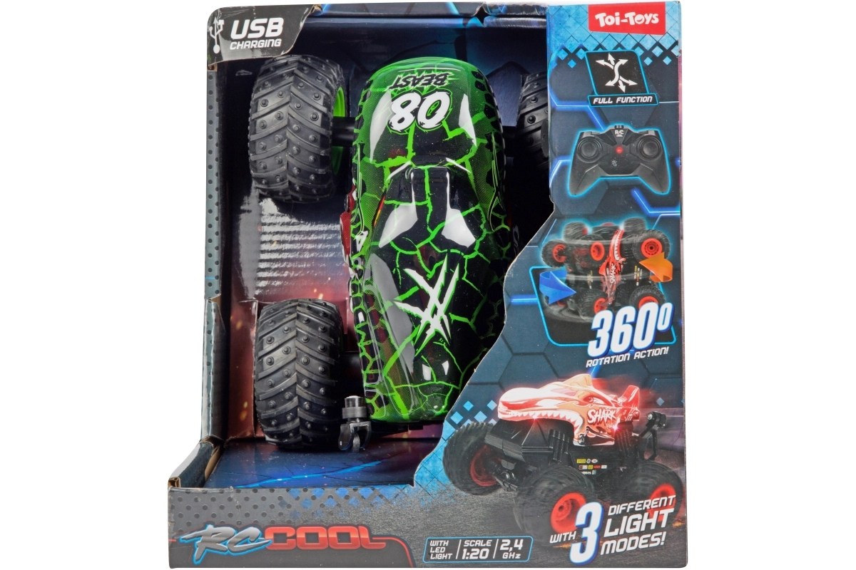 Divertente e resistente RC monster truck 1:20 per bambini dai 3 anni, offre marcia avanti/indietro, sinistra/destra e una speciale funzione di rotazione. L'auto ha una batteria ricaricabile via USB (inclusa), il radiocomando funziona con 2× AA (non incluse). Ideale per il gioco in casa e all'aperto, con ruote robuste e struttura in plastica per una lunga durata.