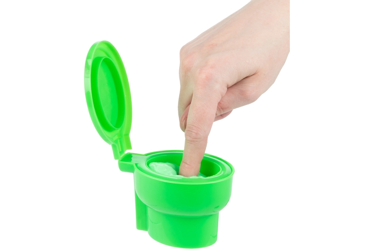 Pratico contenitore di plastica a forma di WC con coperchio ribaltabile che mantiene lo slime fresco e pronto per nuove sessioni di gioco a casa e in viaggio.