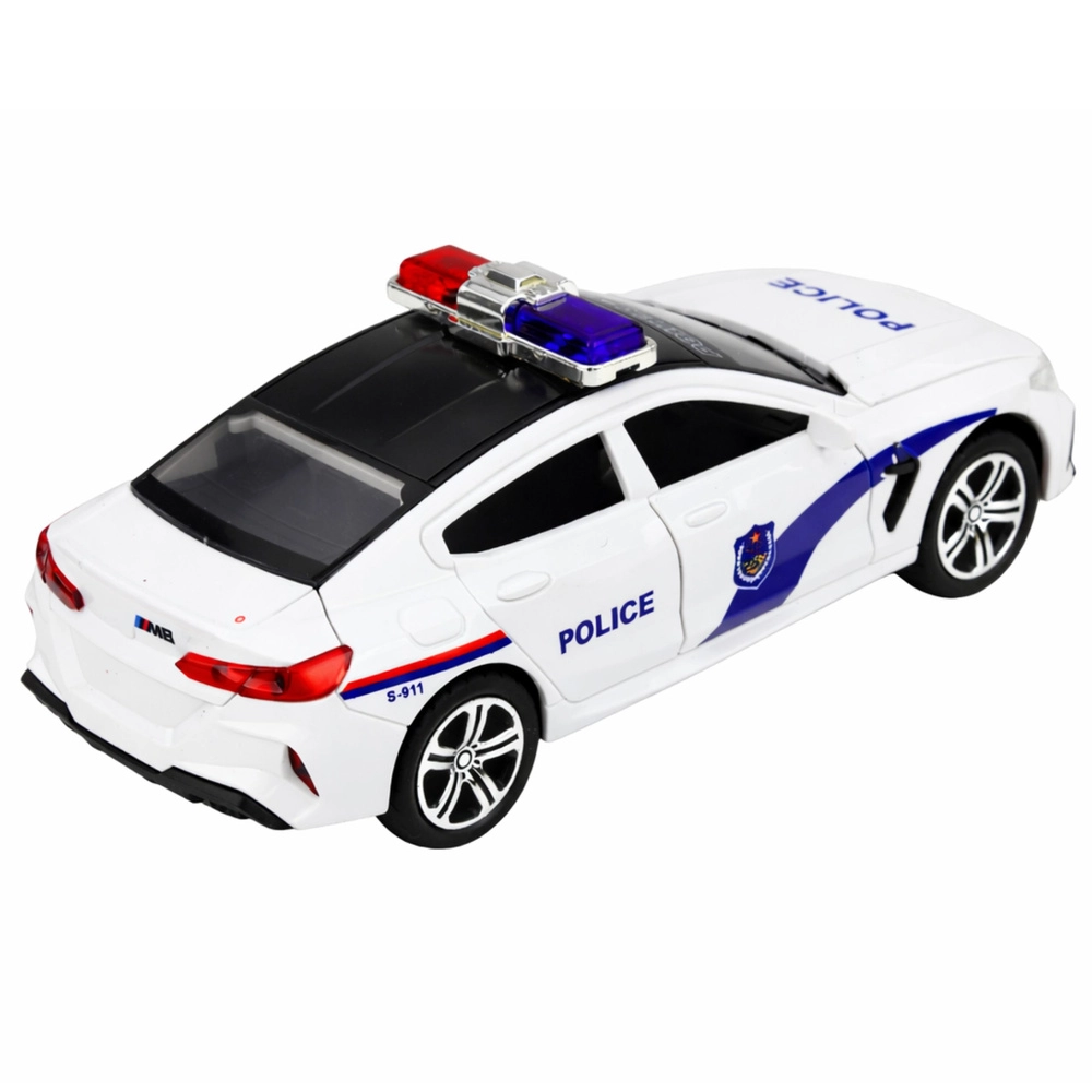Realistica auto della polizia bianca che offre un gioco avvincente con effetti luminosi e sonori, porte anteriori apribili e meccanismo a spinta per avanzare. La lavorazione dettagliata con scritte POLICE, lampeggiante rosso-blu e struttura resistente entusiasmerà i piccoli appassionati dei veicoli di servizio.
