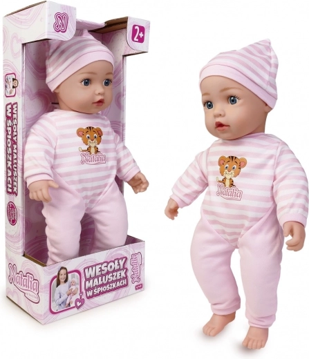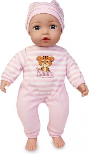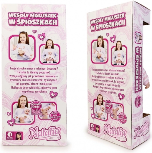 Il dolce bebè Natalia farà felice ogni bambino con funzioni realistiche. Premendo il pancino emette suoni di risata, pianto e lallazione e sa dire “mamma” e “papà”. Un regalo ideale per sviluppare fantasia e capacità di cura.