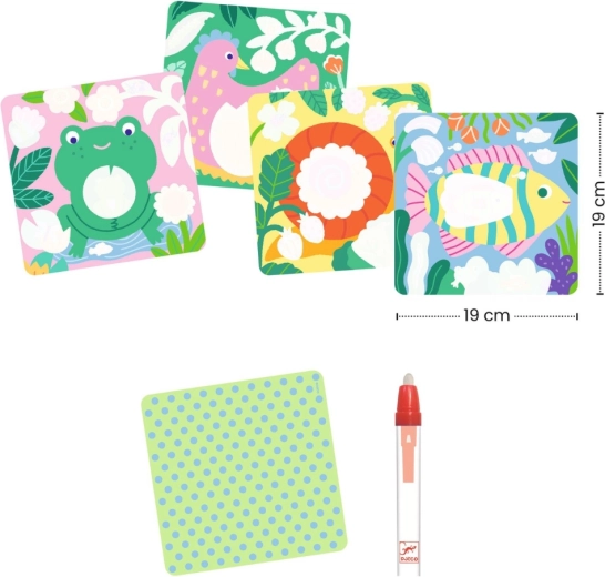 Il set include schede quadrate e robuste con illustrazioni di ranocchia, pesciolino, chiocciolina, uccellino e altri animaletti del giardino, insieme a una penna ad acqua ricaricabile. Un’attività sicura, senza coloranti e adatta sia a casa sia in viaggio.